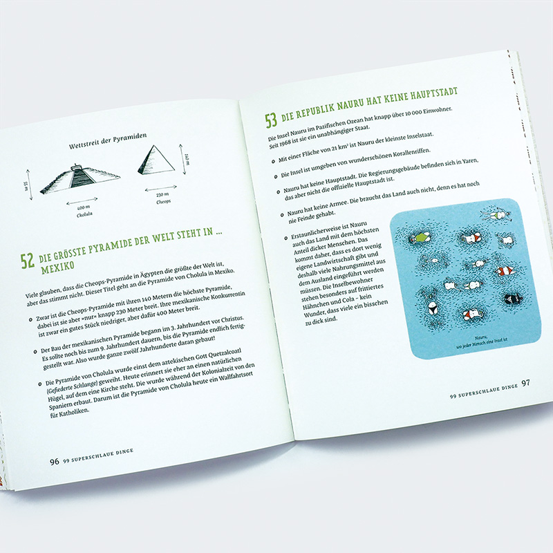 Superschlaues Wissen jetzt auch für unterwegs! Hier sind die kuriosesten, spannendsten und witzigsten Fakten aus der Erfolgsreihe von Mathilda Masters und Louize Perdieus in einem Band versammelt. Wusstest du, dass eine Giraffe sich die Ohren auslecken kann? Oder dass Lachen wirklich süchtig macht? Dass Ketchup früher als Medizin verwendet wurde und Astronauten in Staubsauger pinkeln? Oder dass Spiderman Schuhgröße 145 bräuchte, um an der Decke zu laufen? 99 überraschende Fakten über Flora und Fauna, die Erde, Sprache, Sport, berühmte Menschen, Geschichte, Naturwissenschaften und vieles mehr, humorvoll illustriert und im handlichen Format: Die perfekte Lektüre für alle, die von ungewöhnlichem Wissen nie genug kriegen können.