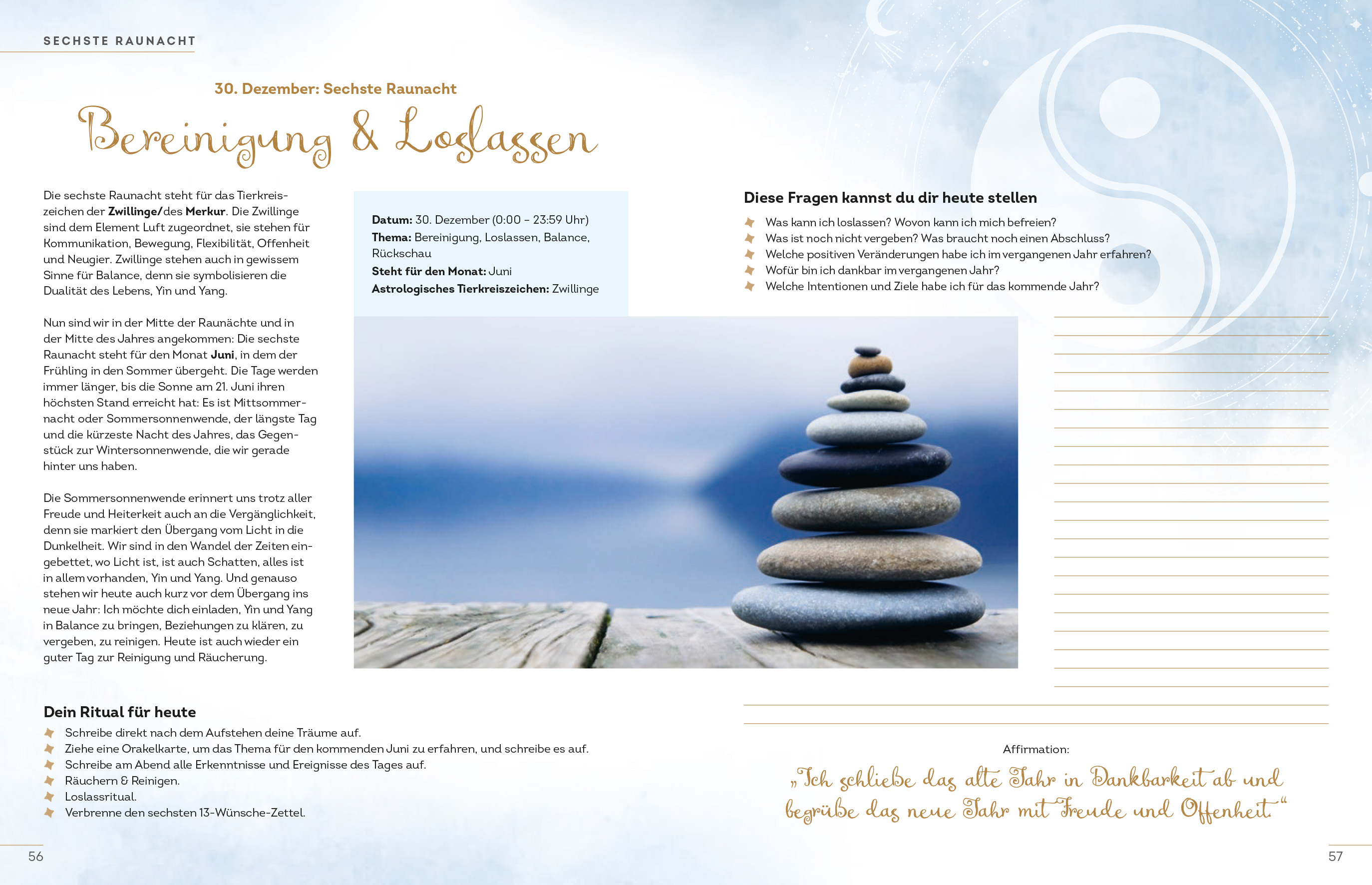 In diesem Erinnerungsbuch kannst du über 5 Jahre hinweg deine Gedanken während der Rauhnächte sammeln und anschließend auf deine Entwicklung und Fortschritte zurückblicken. Ganz egal, ob du bereits mit dem alten Brauch vertraut bist oder gerade erst anfängst, dich für dieses faszinierende Thema zu interessieren, in diesem Erinnerungsbuch hast du den idealen Begleiter gefunden, um dich in den Zauber der Rauhnächte einzufinden und die eigene Spiritualität zu entdecken.