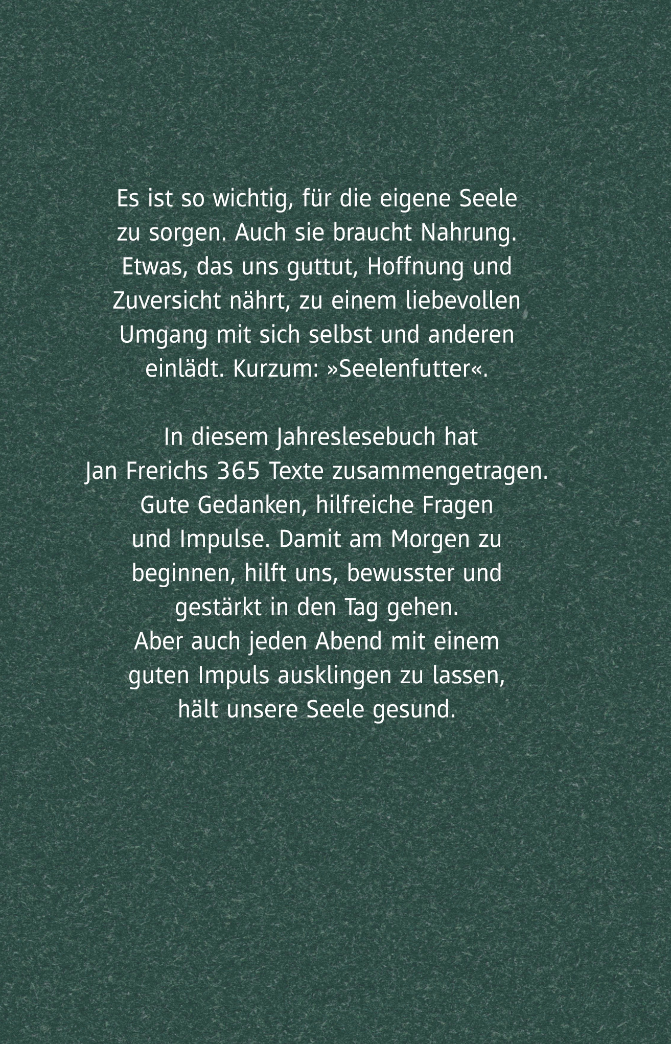 Ob als morgendlicher Start in den Tag oder als abendlicher Rückblick - Jan Frerichs hat 365 wunderbare Texte, die zum Nachdenken anregen und das Herz berühren, zusammengetragen. Damit am Morgen zu beginnen, hilft anders und viel bewusster in den Tag zu gehen. Im besten Sinne gestärkt. Und jeden Abend mit einem Impuls ausklingen zu lassen, Danke zu sagen für alles, was sich an Schönem ereignet, was sich positiv entwickelt hat, das tut einfach gut. Indem wir das Gute immer wieder in den Blick nehmen, rauben wir dem Schlechten seine Macht. So bleibt unsere Seele gesund.