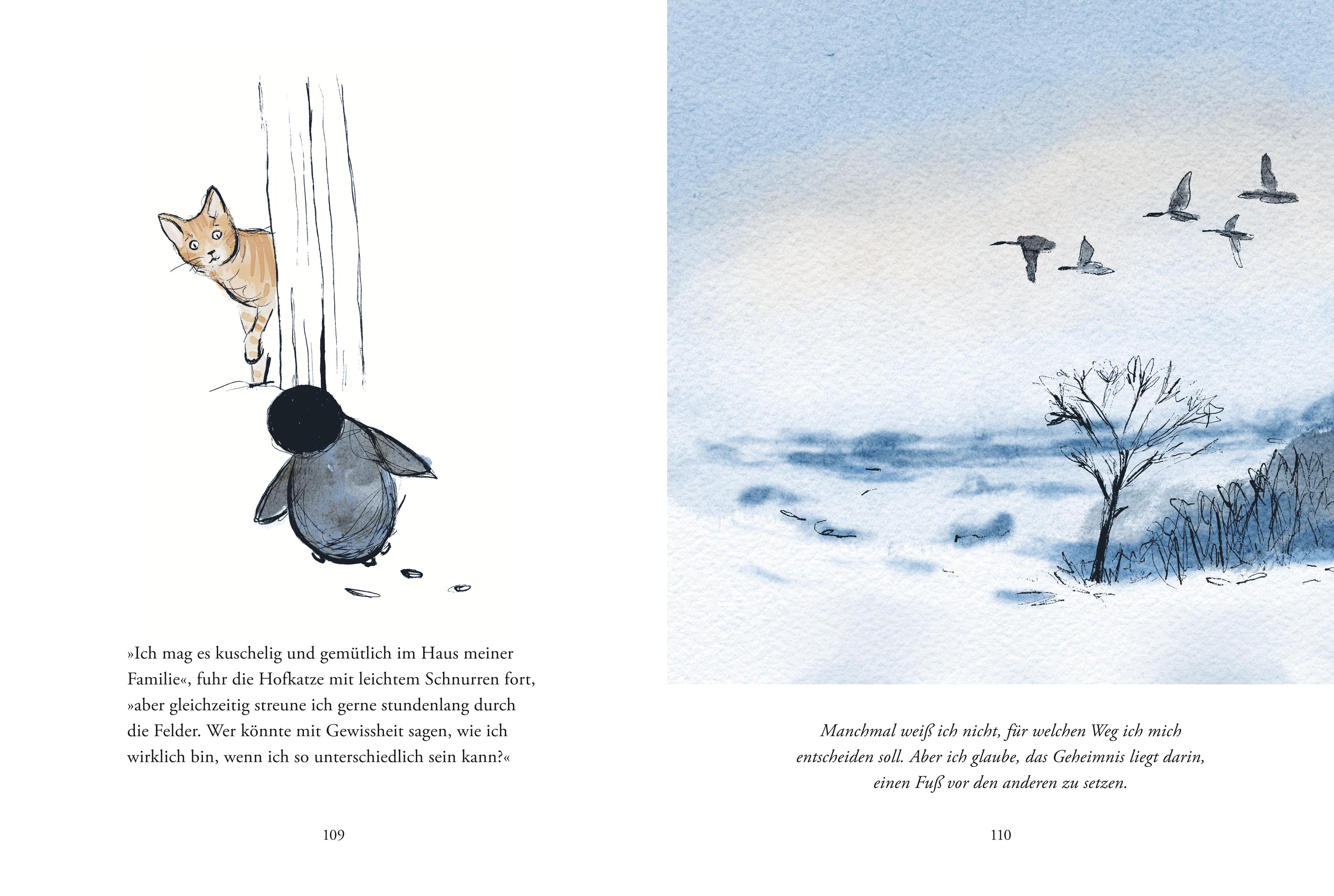 Der kleine Pinguin, verloren im Nirgendwo, sehnt sich nach einem Ort der Wärme und Geborgenheit. Entschlossen begibt er sich auf eine abenteuerliche Reise. Sie führt ihn durch die Jahreszeiten und beschert ihm unverhoffte Freunde. In heilsamen Gesprächen mit dem zuversichtlichen Maulwurf, dem warmherzigen Glühwürmchen oder dem fürsorglichen Fuchs entdeckt der kleine Pinguin die wärmende Kraft der Freundschaft und die Zuversicht in seinen eigenen Weg. Er erkennt: "Jeder Schritt auf meinem Pfad bringt mich näher zu mir selbst. Egal, in welche Richtung ich gehe."