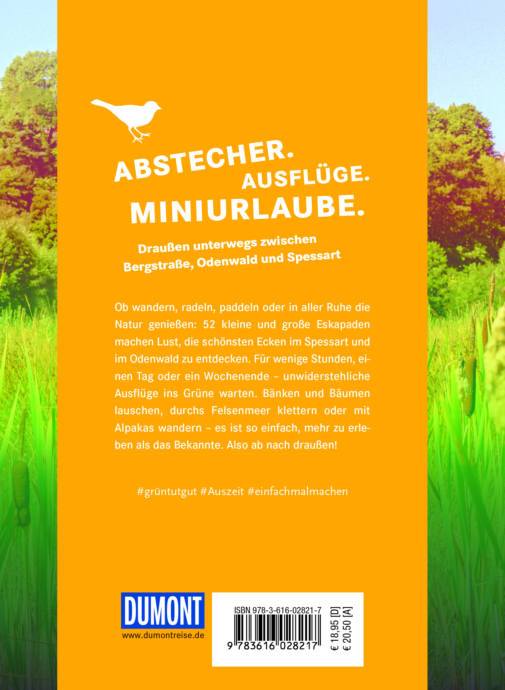 Ob wandern, radeln, paddeln oder in aller Ruhe die Natur genießen: 52 kleine und große Eskapaden machen Lust, die schönsten Ecken im Spessart und im Odenwald zu entdecken. Für wenige Stunden, einen Tag oder ein Wochenende - unwiderstehliche Ausflüge ins Grüne warten. Bänken und Bäumen lauschen, mit Alpakas wandern oder durchs Felsenmeer klettern - es ist so einfach, mehr zu erleben als das Bekannte. Also ab nach draußen!