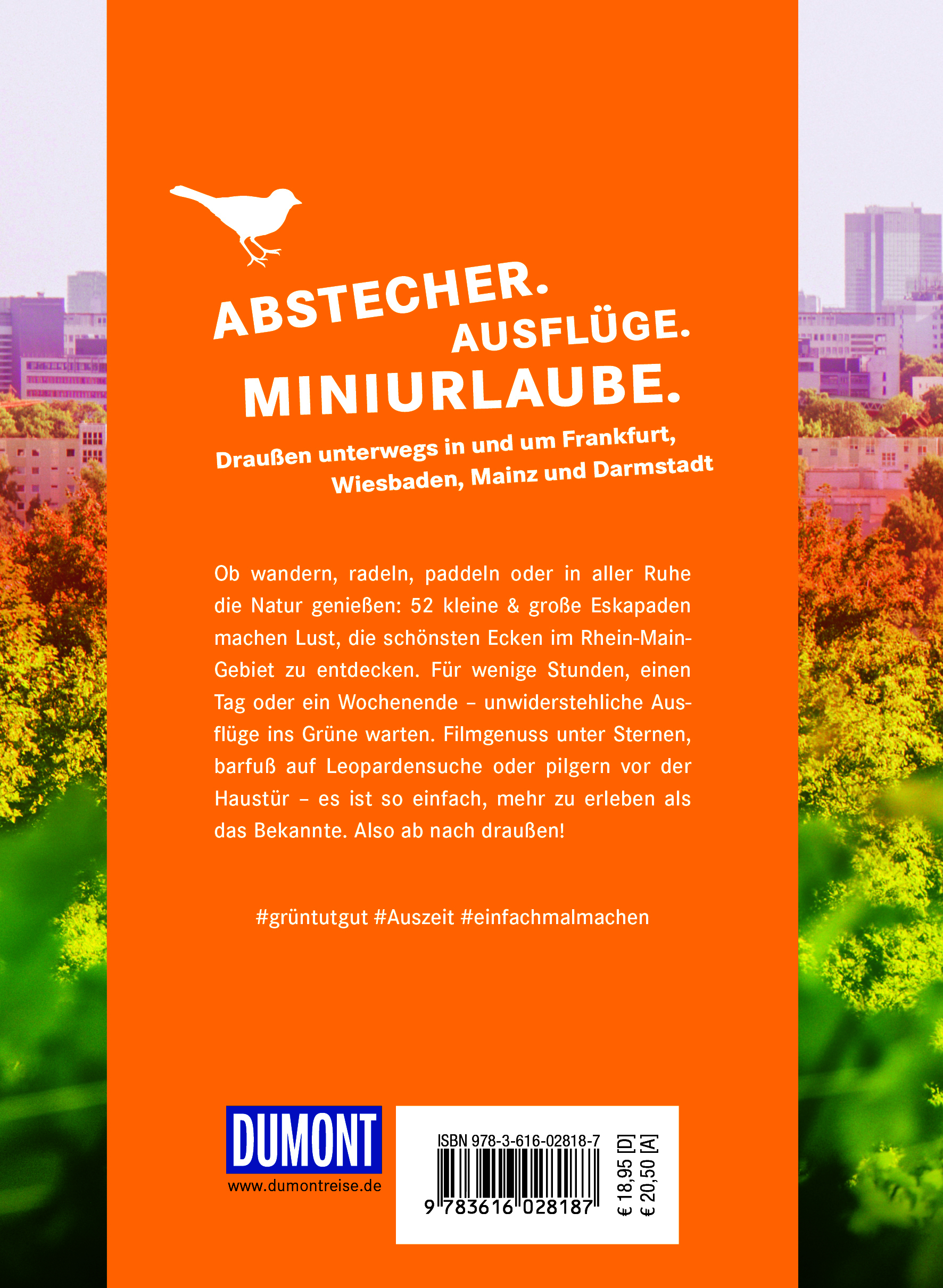 Ob wandern, radeln, paddeln oder in aller Ruhe die Natur genießen: 52 kleine und große Eskapaden machen Lust, die schönsten Ecken der Rhein-Main-Region zu entdecken. Für wenige Stunden, einen Tag oder ein Wochenende - unwiderstehliche Ausflüge ins Grüne vom Hunsrück bis zum Spessart warten. Filmgenuss unter Sternen, barfuß auf Leopardensuche, pilgern vor der Haustür ... - es ist so einfach, mehr zu erleben als das Bekannte. Also ab nach draußen!
