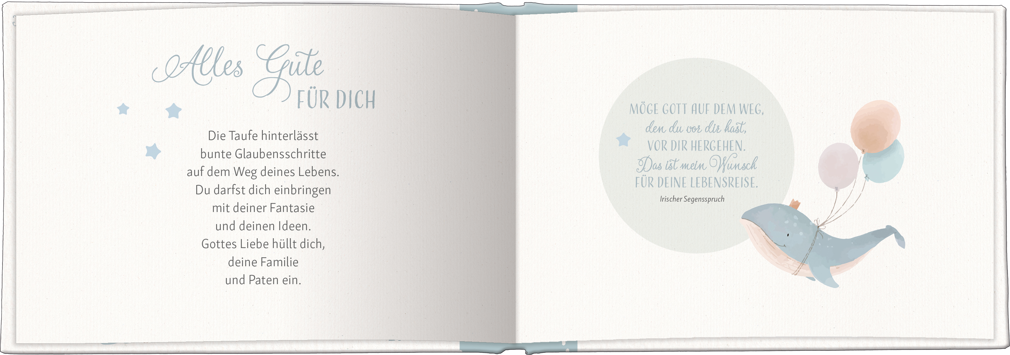 Mit diesem Büchlein können Sie von ganzem Herzen zum Fest der Taufe gratulieren und liebevolle Gedanken für den Glaubensweg überbringen. Warmherzige Segenswünsche vermitteln ein Gefühl von Geborgenheit und lassen den Täufling spüren: Gott ist immer bei mir. Bei der liebevollen Gestaltung in zarten Blautönen fällt der niedliche Wal sofort ins Auge. Als christliches Symbol geht der Wal auf die biblische Erzählung „Jona und der Wal“ zurück. Der Wal gilt als Zeichen für ein neues Leben. Im Zusammenhang mit der Taufe ist damit das Leben in der christlichen Gemeinschaft gemeint. Dieses kleine Buch ist ein besonderes Geschenk zur Taufe, das auch noch lange nach dem Fest viel Freude schenkt!