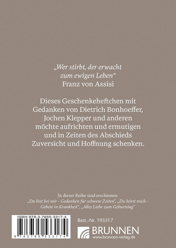 Dieses Geschenkheftchen möchte in Zeiten des Abschiednehmens und der Trauer Trost spenden und aufrichten. Einfühlsame und ermutigende Worte für Menschen, die Abschied nehmen müssen. Die Texte sprechen von einer Hoffnung, die das Herz zur Ruhe kommen lässt und Zuversicht schenkt, im Alltag wieder Vertrauen zu fassen.