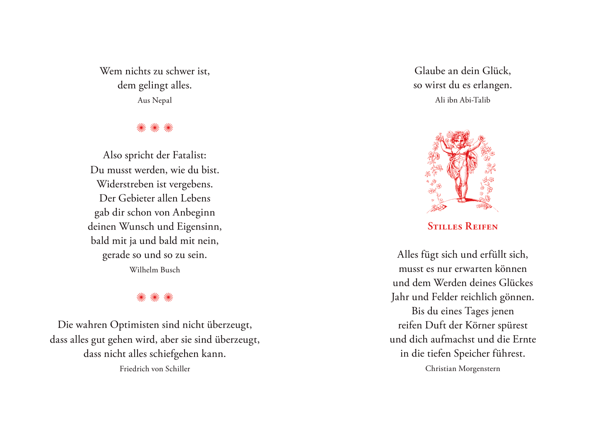 Der echte rote Faden ist das Markenzeichen dieser ausgefallenen Geschenkbuchreihe. Mit gepflegtem Design, edlem Papier und inspirierenden Gedichten und Gedanken ist dieses von Hand gebundene Buch ein liebevolles Geschenk, das zu vielen Anlässen Zuversicht und Lebensfreude überbringt.