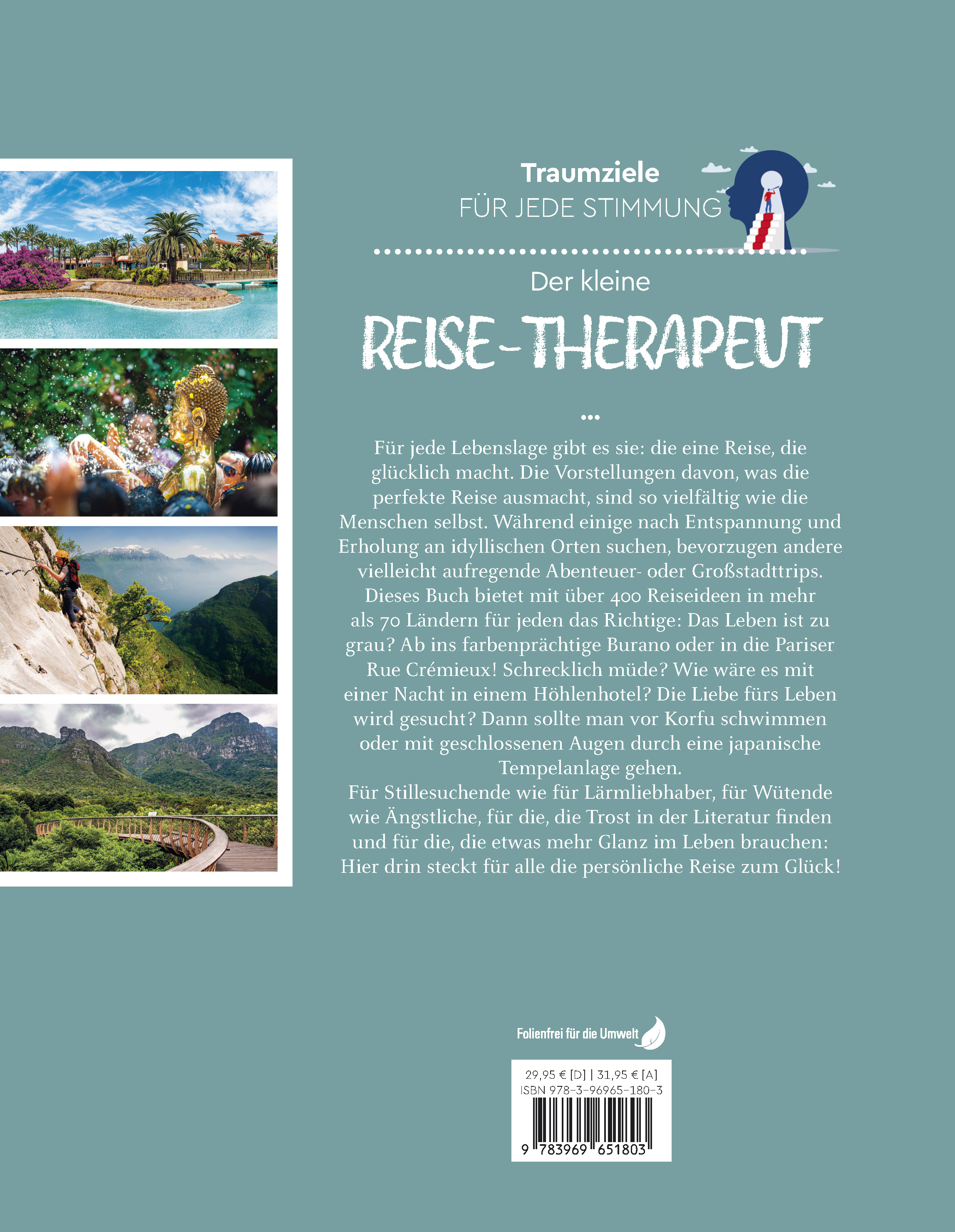 Dieses KUNTH-Reisebuch „Der kleine Reise-Therapeut“ bietet für jeden das Richtige: Das Leben ist zu grau? Ab ins farbenfrohe Burano! Sie wollen sich mal richtig gruseln? Einmal im Spukschloss in Nordirland übernachten! Sie benötigen Inspiration? Wie wäre es mit der Einsamkeit finnischer Wälder? Sie wollen was fürs Herz? Auf zu den glücklichsten Menschen nach Bhutan! Für jede Lebenslage gibt es ihn: den einen Ort, der glücklich macht.