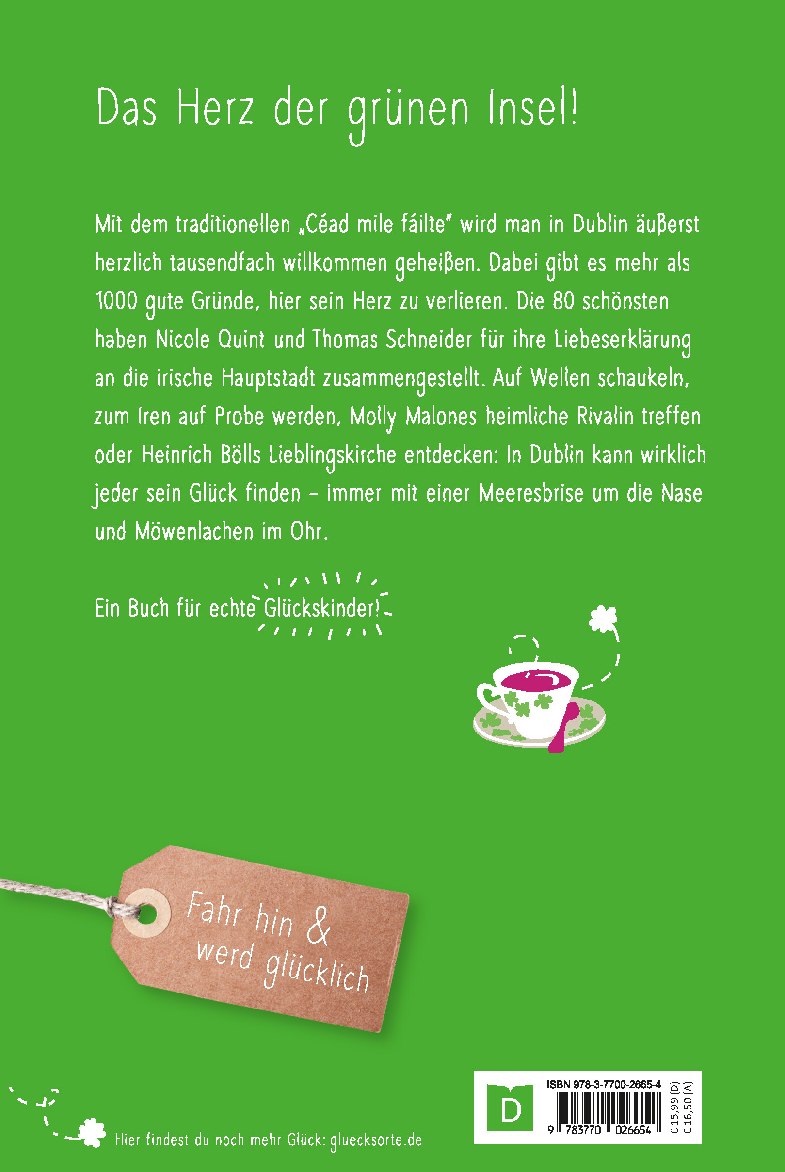 Mit dem traditionellen "Céad mile fáilte" wird man in Dublin äußerst herzlich tausendfach willkommen geheißen. Dabei gibt es mehr als 1000 gute Gründe, hier sein Herz zu verlieren. Die 80 schönsten haben Nicole Quint und Thomas Schneider für ihre Liebeserklärung an die irische Hauptstadt zusammengestellt. Auf Wellen schaukeln, zum Iren auf Probe werden, Molly Malones heimliche Rivalin treffen oder Heinrich Bölls Lieblingskirche entdecken: In Dublin kann wirklich jeder sein Glück finden - immer mit einer Meeresbrise um die Nase und Möwenlachen im Ohr.