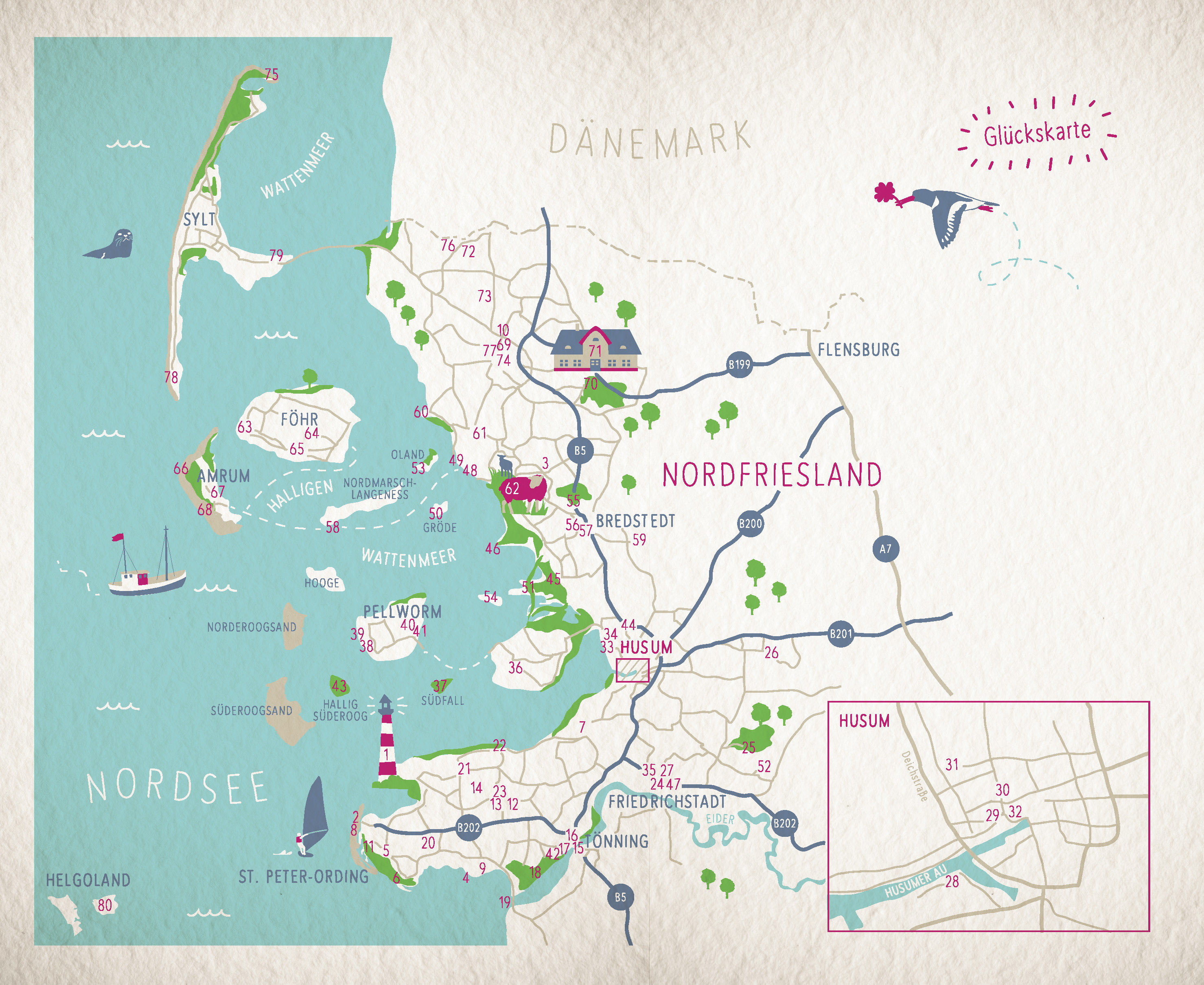 Ob man einem Wattwurm begegnet, eine Trümmertorte vernascht oder sich einfach in den größten Sandkasten der Republik wirft: Die kilometerlangen Sandstrände, sattgrünen Weiden, pittoresken Friesendörfer mit reetgedeckten Kapitänshäusern und das Wattenmeer mit seiner einzigartigen Fauna bilden die perfekte Kulisse für große und kleine Glücksmomente in Deutschlands hohem Norden. Wer hier das Glück sucht, wird zwischen Deich und Dünen auf jeden Fall fündig!