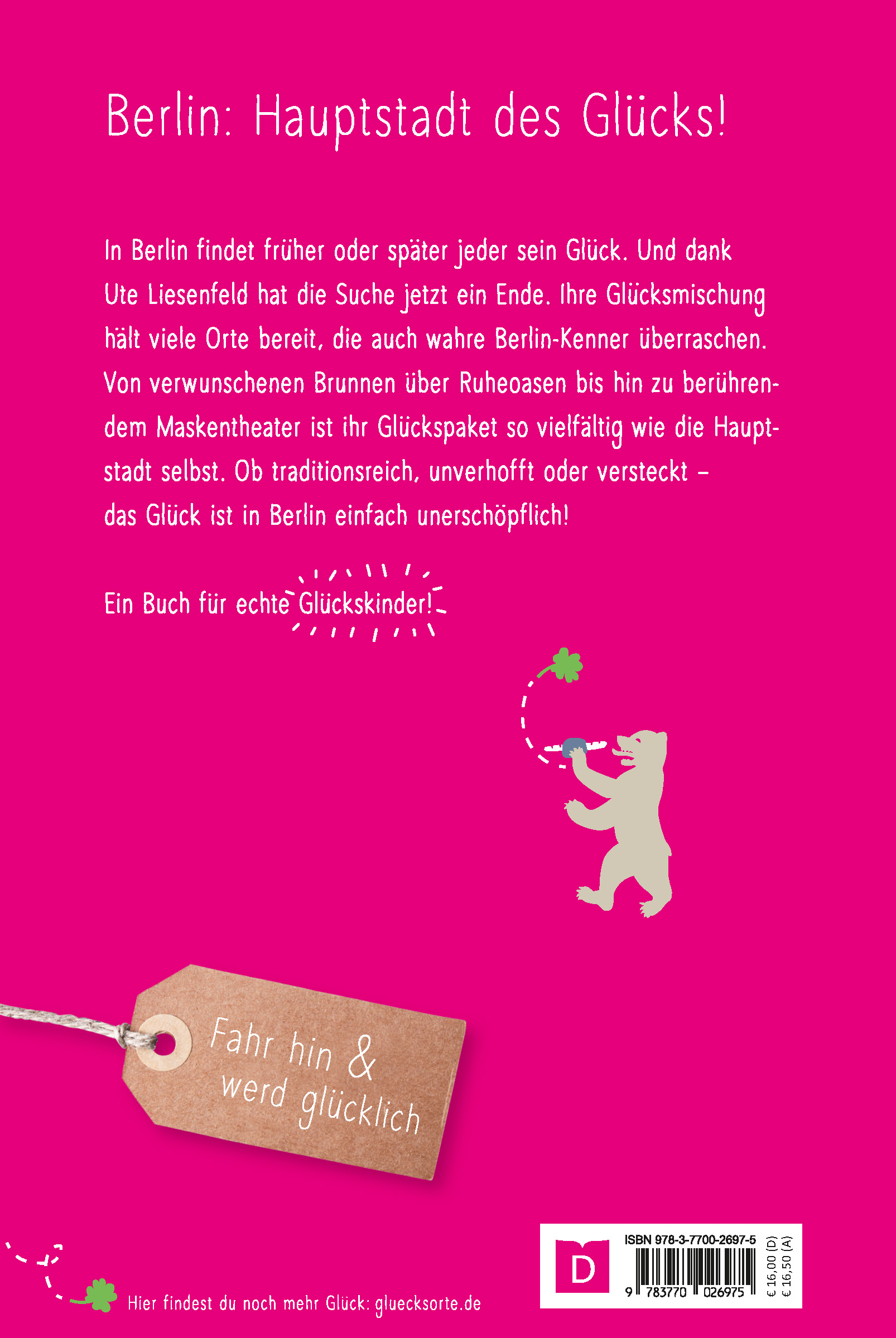 Berlin: Hauptstadt des Glücks! In Berlin findet früher oder später jeder sein Glück. Und dank Ute Liesenfeld hat die Suche jetzt ein Ende. Ihre Glücksmischung hält viele Orte bereit, die auch wahre Berlin-Kenner überraschen. Von verwunschenen Brunnen über Ruheoasen bis hin zu berührendem Maskentheater ist ihr Glückspaket so vielfältig wie die Hauptstadt selbst. Ob traditionsreich, unverhofft oder versteckt - das Glück ist in Berlin einfach unerschöpflich! Ein Buch für echte Glückskinder!