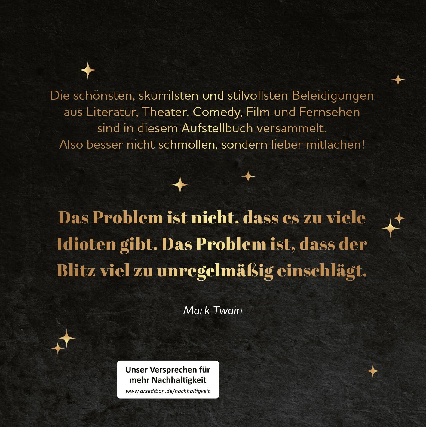 Dieses Aufstellbuch versammelt 101 stilvolle Beleidigungen für alle Lebenslagen - zusammengestellt von dem renommierten Literaturwissenschaftler Wieland Schwanebeck. Von scharfsinnigen Schmähreden aus der Antike bis hin zu ironischen Kommentaren aus der modernen Unterhaltungsindustrie: Der Tischaufsteller enthält eine bunte Mischung genialer Beleidigungen aus den unterschiedlichsten Bereichen. Hier brillieren prominente Persönlichkeiten wie Politiker:innen, Autor:innen, Fernsehstars oder Fußballspieler mit bissigen Bemerkungen. Und auch wenn niemand gerne beleidigt wird - die humorvollen, oft bitterbösen und immer extrem wortgewandten Sprüche haben ihren ganz eigenen Charme und Witz.