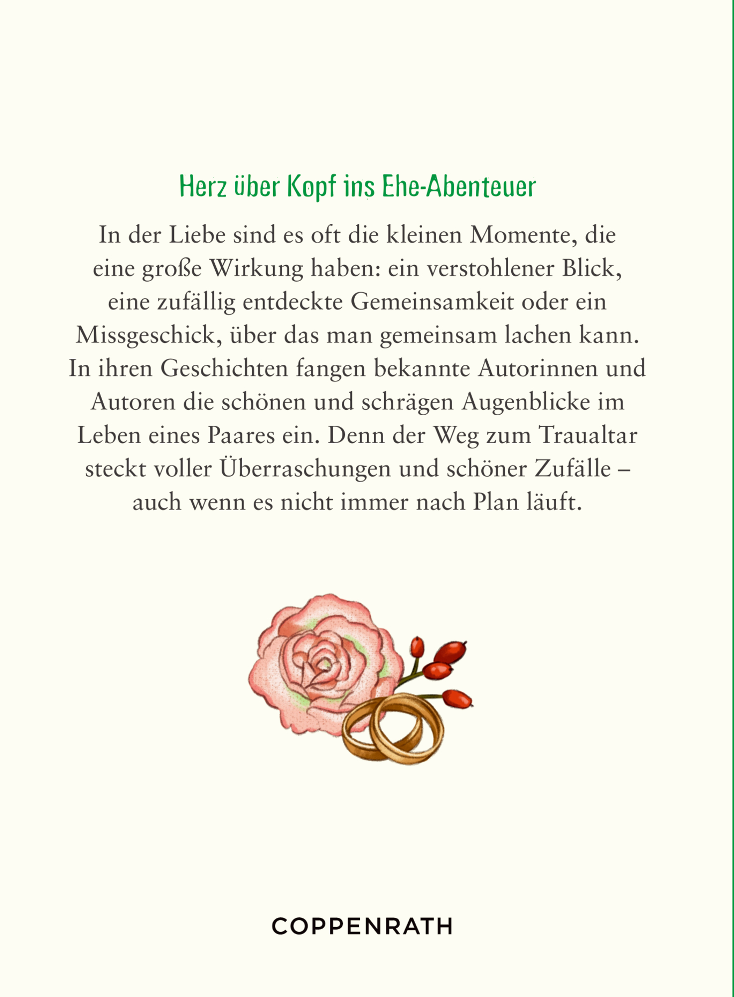 Liebe ist, … wenn man sich traut. Diese Geschichten bekannter Autorinnen und Autoren laden zu einem unterhaltsamen Streifzug durch die aufregendsten Stunden im Leben eines Paares ein: Sie erleben Überraschungen, Missverständnisse und unvergessliche Momente des Glücks. Liebevolle Illustrationen fangen die Magie und den Wahnsinn ein, die eine Ehe mit sich bringt. Ein zauberhafter Begleiter für Brautpaare, Hochzeitsgäste und alle Romantiker, die sich gern vom Hochzeitsfieber anstecken lassen.