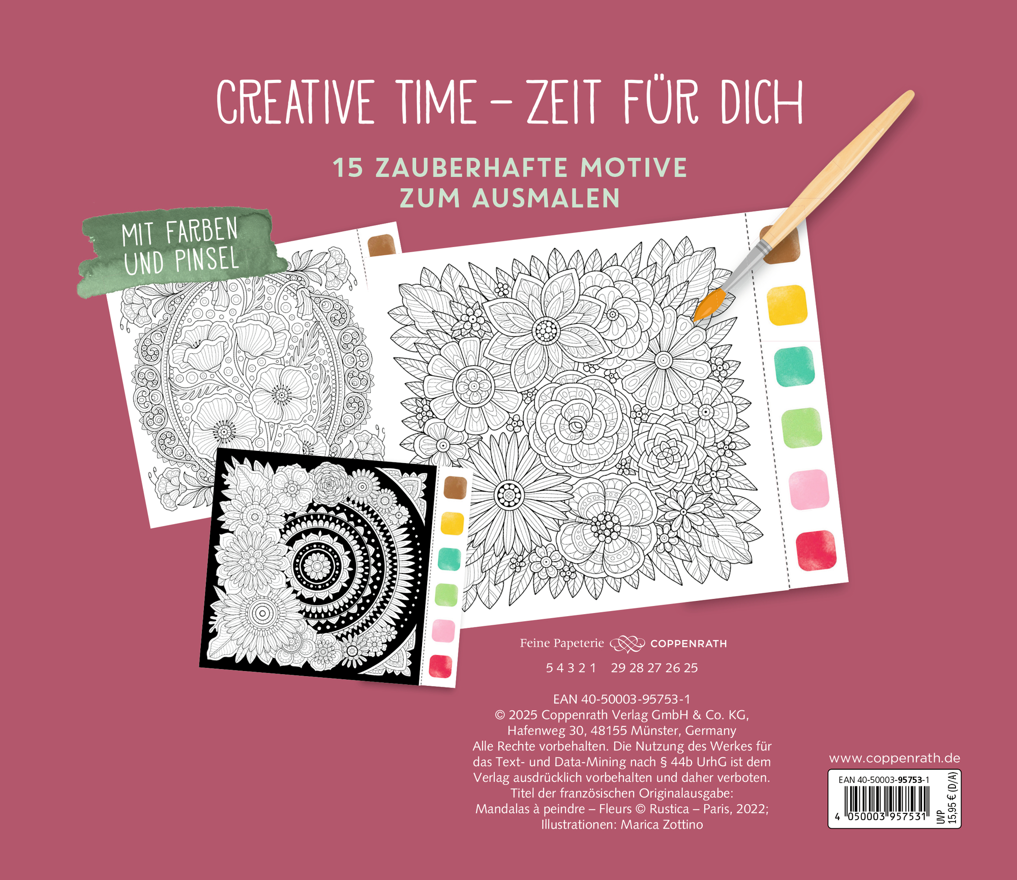 Ein Malblock mit 15 wundervollen Ausmalbildern, 6 Aquarellfarben und Pinsel.