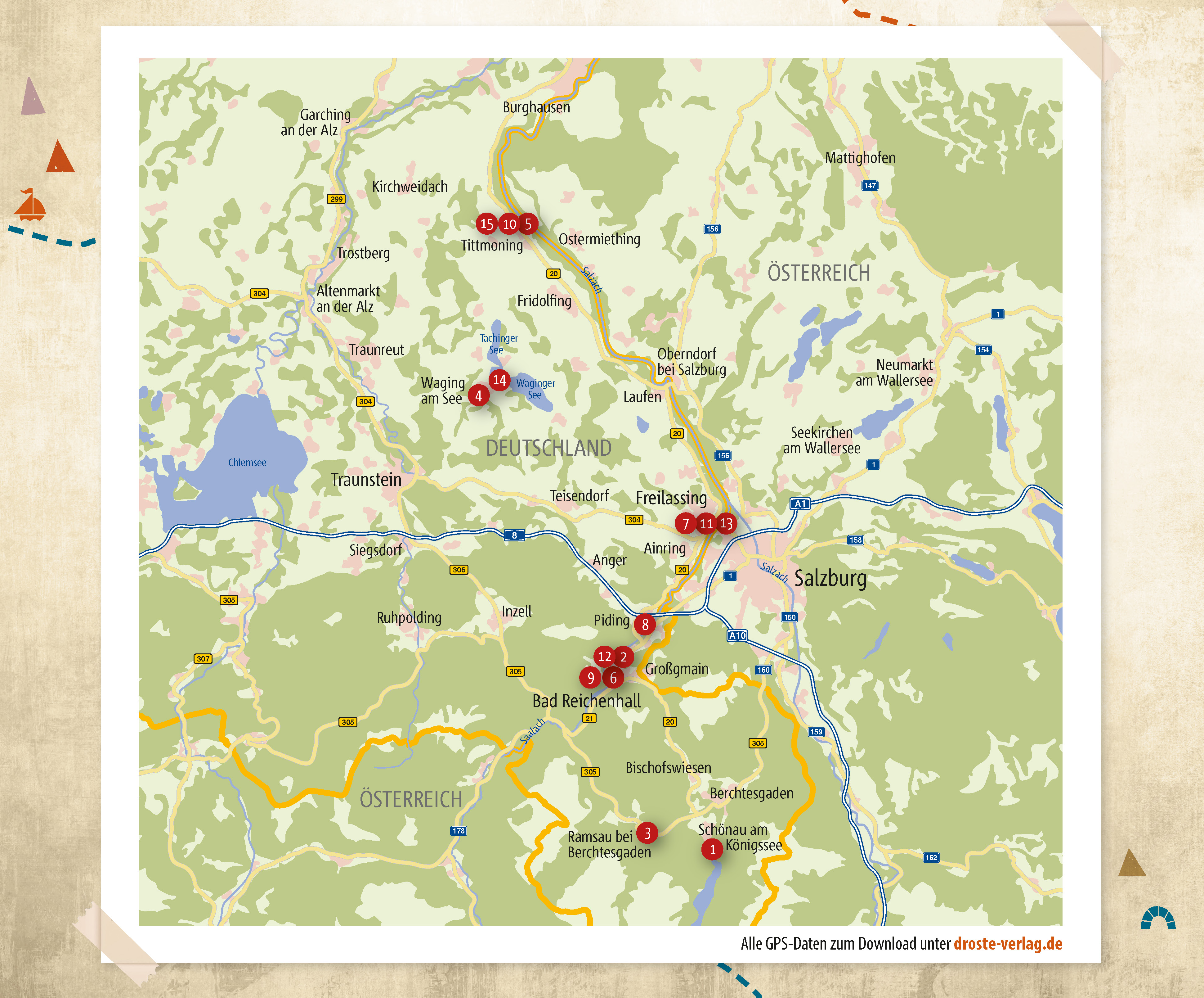 Ob im Schatten der dramatischen Bergkulisse des Watzmanns, entspannt durchs grün-blaue Hügelland des Rupertiwinkels oder grenzüberschreitend Richtung Salzburg radeln: Im Berchtesgadener Land, das zu den schönsten Flecken Oberbayerns zählt, ist all das möglich. Die bildhübschen Inn-Salzach-Städte, Kirchen, Burgen und Badestrände sind Seelenorte am Wegesrand. Während man hier in die Pedale tritt, sorgt der traumhafte Mix aus Natur und Kultur für zahllose Glücksmomente.