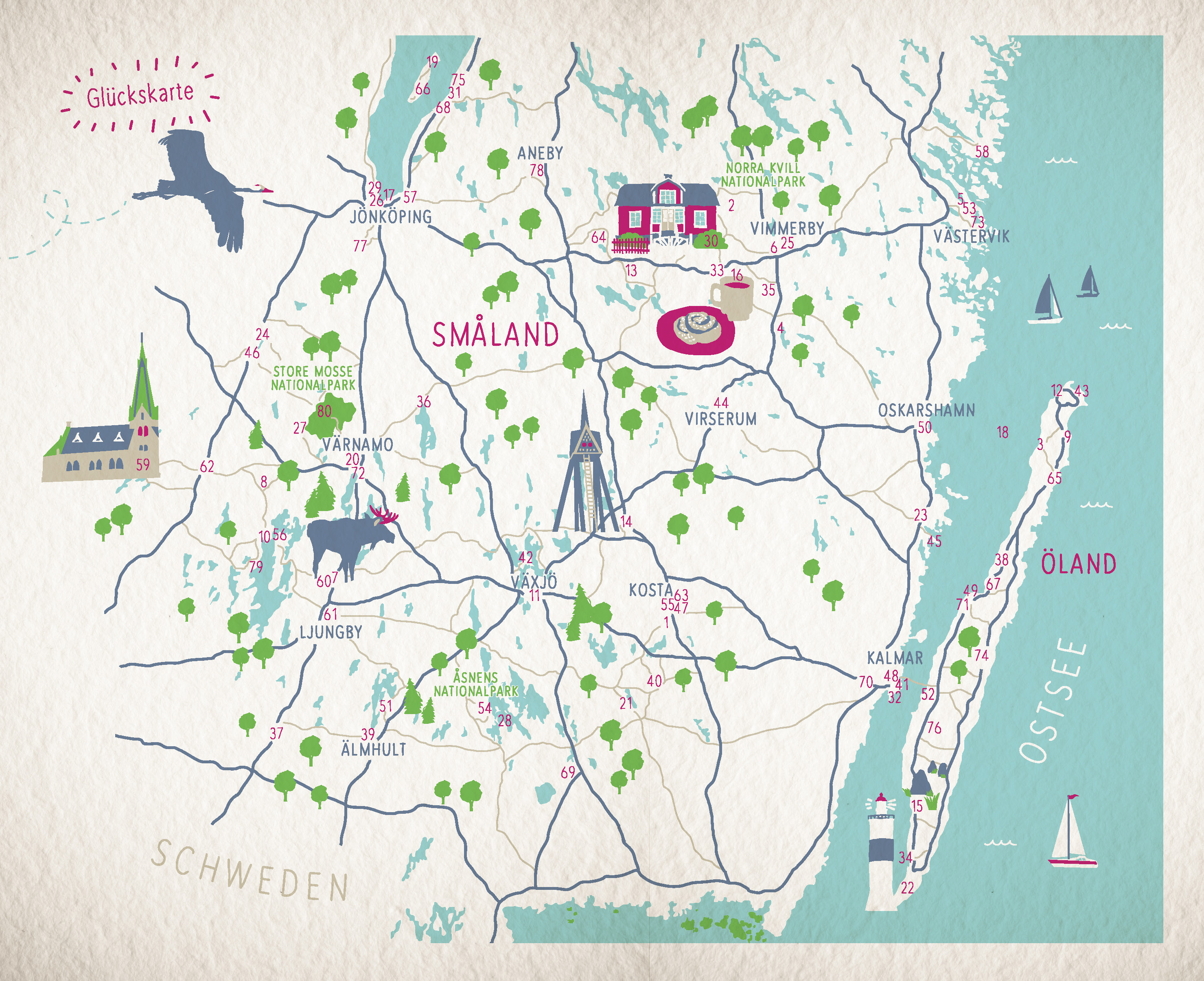 Hej und välkommen in den unendlichen Wäldern Smålands und auf der Sonneninsel Öland! Neben Elchparks und Seen, gemütlichen Cafés und Fischrestaurants wimmelt es von mittelalterlichen Burgen, zeitlosem Design und Glaskunst. Ob auf dem Postboot durch den Schärengarten, beim Gartenspaziergang durch den königlichen Sommersitz oder bei einer Zeitreise im historischen Schienenbus - hier ist die Welt wirklich, wie sie jedem gefällt.