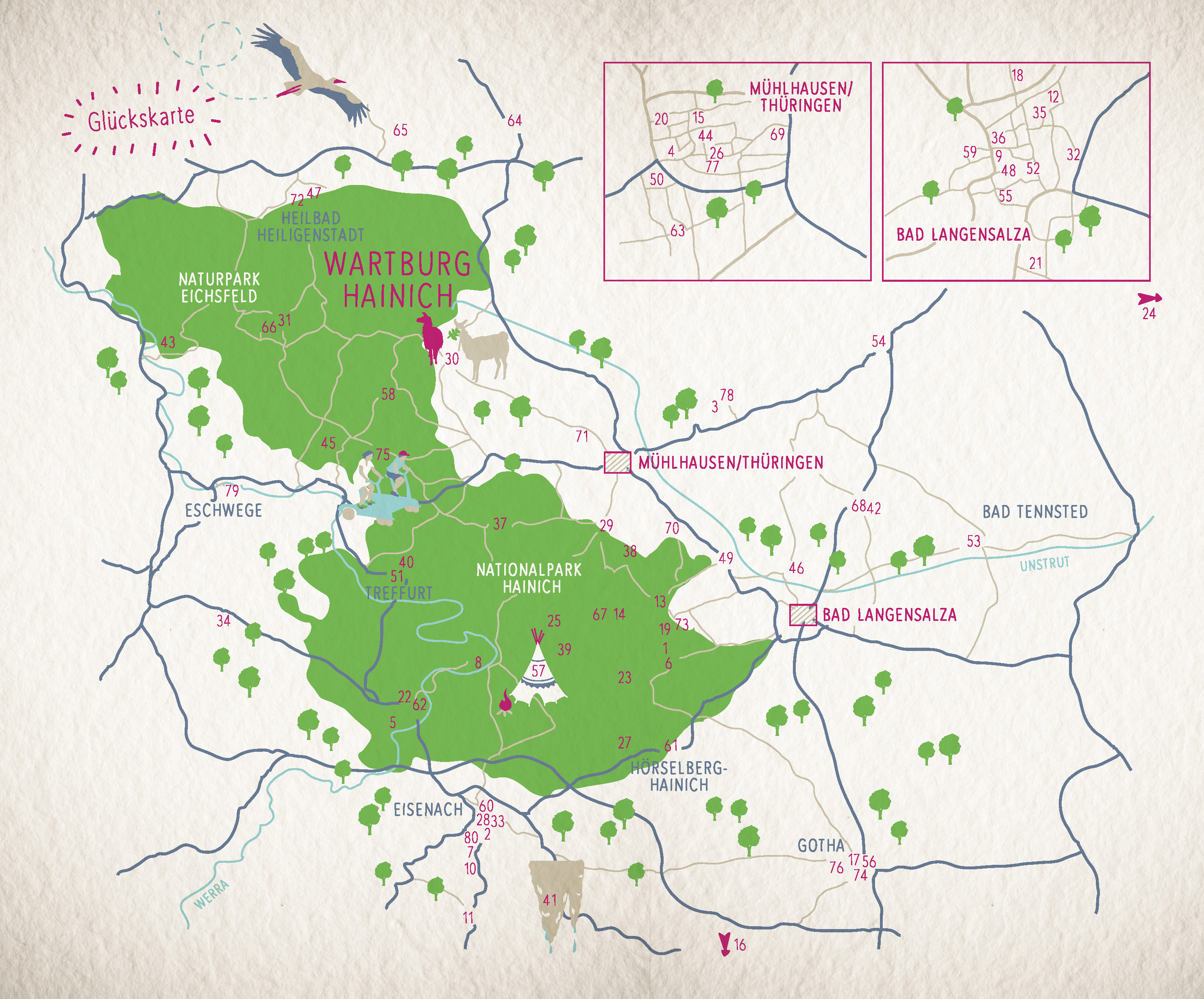 Weltberühmtheiten und versteckte Geheimnisse, wilde Natur und faszinierende Hochkultur - die Welterberegion Wartburg Hainich garantiert Abwechslung pur! Zwischen Werra und Unstrut, Nationalpark und Wartburg präsentiert sich eine facettenreiche Landschaft voller Überraschungen. Märchenhafte Schlösser, alte Ritterburgen, eine Drachenschlucht und echter Urwald machen Ausflüge in Deutschlands grüner Mitte zu unvergesslich schönen Abenteuern. Hier ist das Glück zu Hause!