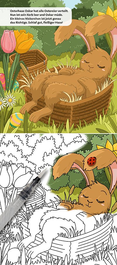 Mit dem beigefügten Wasserstift zauberst du Farbe in die liebevoll gestalteten Oster-Motive rund um Osterhase Oskar und seine Freunden. Einfach mit der Spitze des gefüllten Wasserstifts über die Motive malen und schon werden versteckte Elemente und Details durch das Wasser sichtbar. Zusätzlich gibt es auf jedem Bild Fehler zu entdecken. Nach dem Trocknen können die Bilder erneut bemalt werden - für unendlichen Malspaß. Stift auf, Wasser rein, Stift zu - losgemalt!