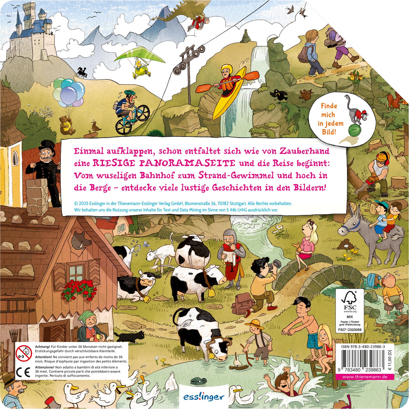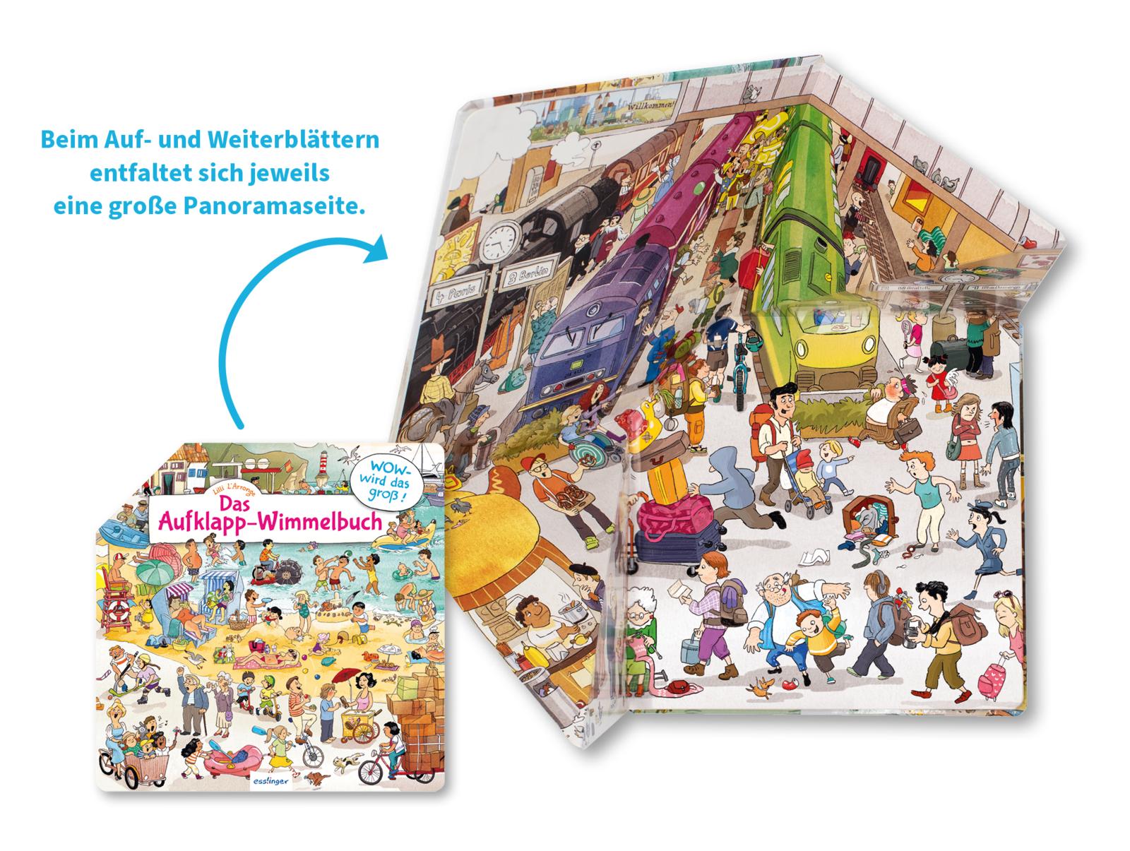 Aus kleinem Buch wird großer Inhalt: Mit dem Aufklappen des Buchdeckels entfaltet sich wie von Zauberhand eine große Panoramaseite. So riesig, dass man stundenlang mit den Augen darin herumwandern kann, um sich die Figuren und Bildergeschichten ganz genau anzuschauen. Und Geschichten gibt es hier viele: lustige, spannende und überraschende. Sie animieren kleine und große Betrachter:innen, sich zu den Szenen Dialoge auszudenken und in den Bildern zu lesen.