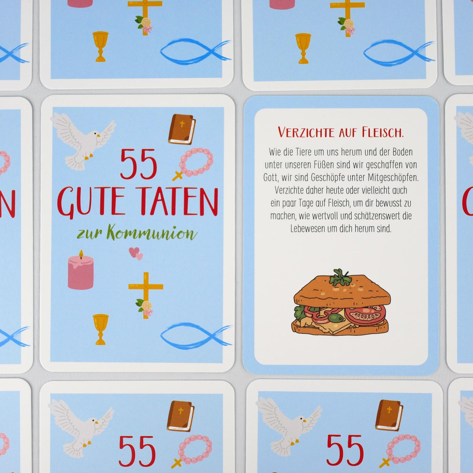 »Wer anderen hilft, dem wird geholfen.« So steht es in der Bibel. Und »wer anderen Gutes tut, dem geht es selber gut«. Doch was so einfach klingt, ist im wirklichen Leben gar nicht so einfach. Dabei sind es oft schon kleine Dinge, die Großes bewirken: einem Mitschüler helfen, der einsamen alten Dame im Haus einen Kuchen backen, Müll sammeln im Park oder eine Baumpatenschaft. Dieses Kartendeck enthält 55 Ideen und Anleitungen für segensreiche, gute Taten, die Kommunionskinder einfach umsetzen können. Das perfekte Geschenk, das jungen Menschen auf kreative Art christliche Werte vermittelt und ihnen Mut, Glück und Zuversicht schenkt.