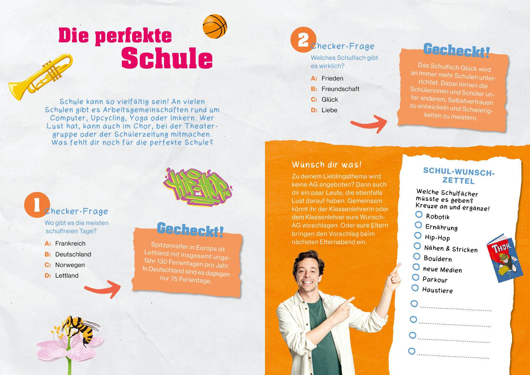 In diesem Schülerkalender erwarten dich viele bunte Seiten zum Ausfüllen und kreativ sein. Neben praktischen Wochen- und Monatsübersichten im coolen Checker-Look gibt es natürlich jede Menge Sachwissen und spannende Checker-Fragen. Entdecke jeden Monat tolle Extras und Mitmachideen: Ob Tests, coole DIYs, Experimente oder Rezepte für gesunde Pausensnacks, mit dem Checker Tobi-Schülerkalender wird dir ganz sicher nicht langweilig. Finde heraus, was für ein Lerntyp du bist, entdecke in einem Experiment das Farbspektrum und lerne faszinierende Tricks, mit denen du deine Freund*innen in der Pause beindrucken kannst.