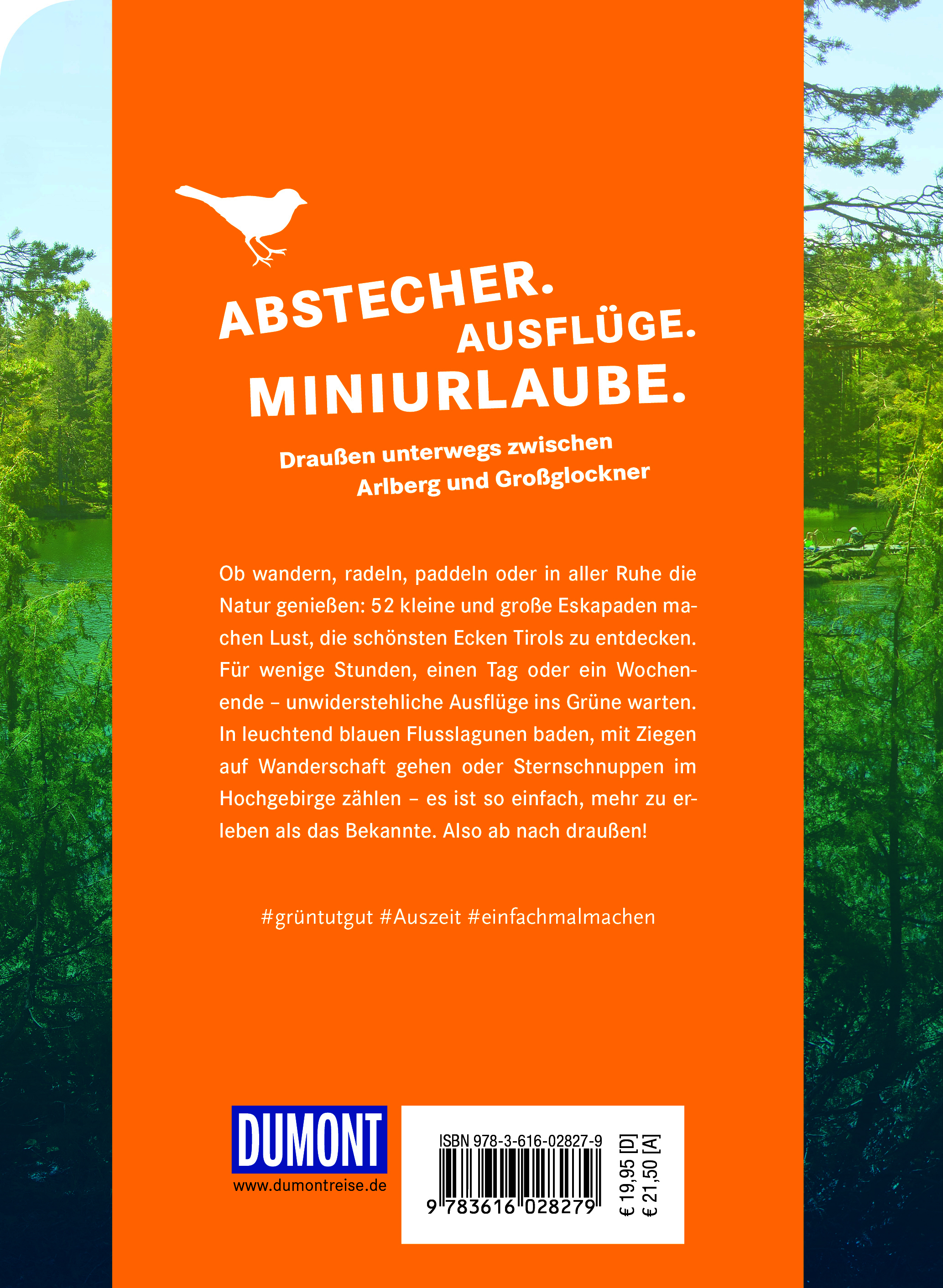 Ob wandern, radeln, paddeln oder in aller Ruhe die Natur genießen: 52 kleine und große Eskapaden machen Lust, die schönsten Ecken Tirols zu entdecken. Für wenige Stunden, einen Tag oder ein Wochenende - unwiderstehliche Ausflüge ins Grüne warten. In leuchtend blauen Flusslagunen baden, mit Ziegen auf Wanderschaft gehen oder Sternschnuppen im Hochgebirge zählen - es ist so einfach, mehr zu erleben als das Bekannte. Also ab nach draußen!