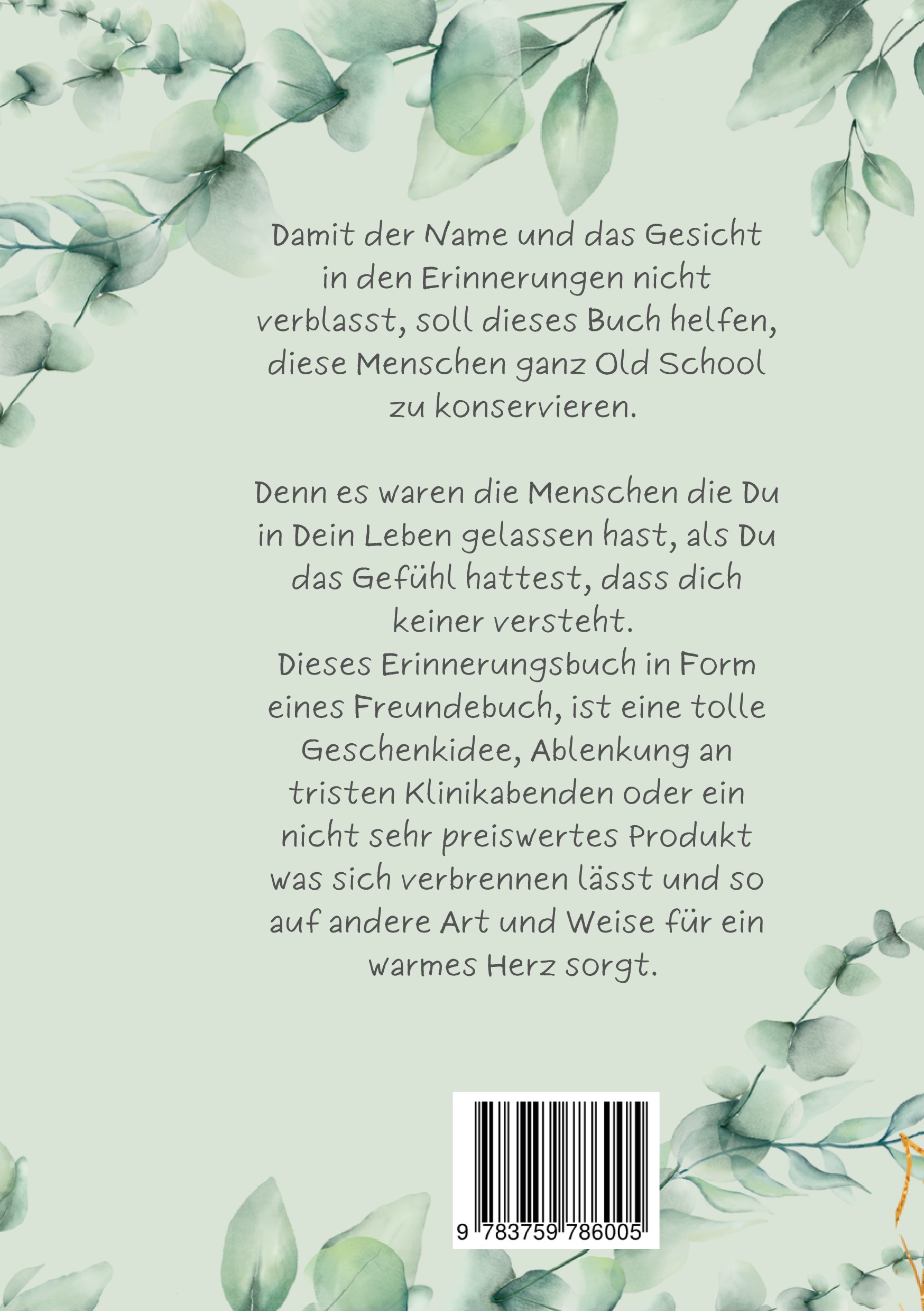 Dieses Erinnerungsbuch in Form eines Freundebuch, ist eine tolle Geschenkidee, Ablenkung an tristen Klinikabenden oder ein nicht sehr preiswertes Produkt was sich verbrennen lässt und so auf andere Art und Weise für ein warmes Herz sorgt.