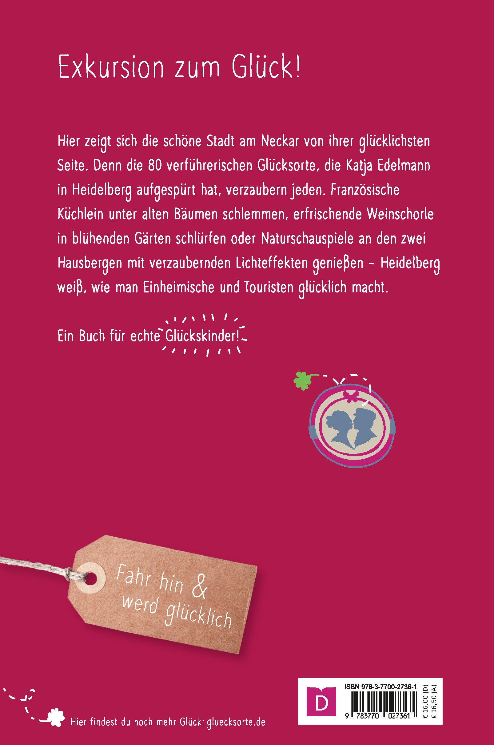 Hier zeigt sich die schöne Stadt am Neckar von ihrer glücklichsten Seite. Denn die 80 verführerischen Glücksorte, die Katja Edelmann in Heidelberg aufgespürt hat, verzaubern jeden. Französische Küchlein unter alten Bäumen schlemmen, erfrischende Weinschorle in blühenden Gärten schlürfen oder Naturschauspiele an den zwei Hausbergen mit verzaubernden Lichteffekten genießen - Heidelberg weiß, wie man Einheimische und Touristen glücklich macht. Ein Buch für echte Glückskinder!
