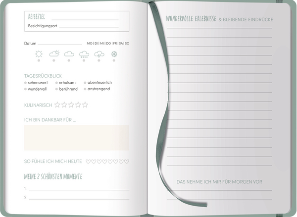 Reisetagebuch 13 x 19 cm zum Ankreuzen und Ausfüllen, mit Lesebändchen und Gummiband, 160 Seiten SchreibLiebe