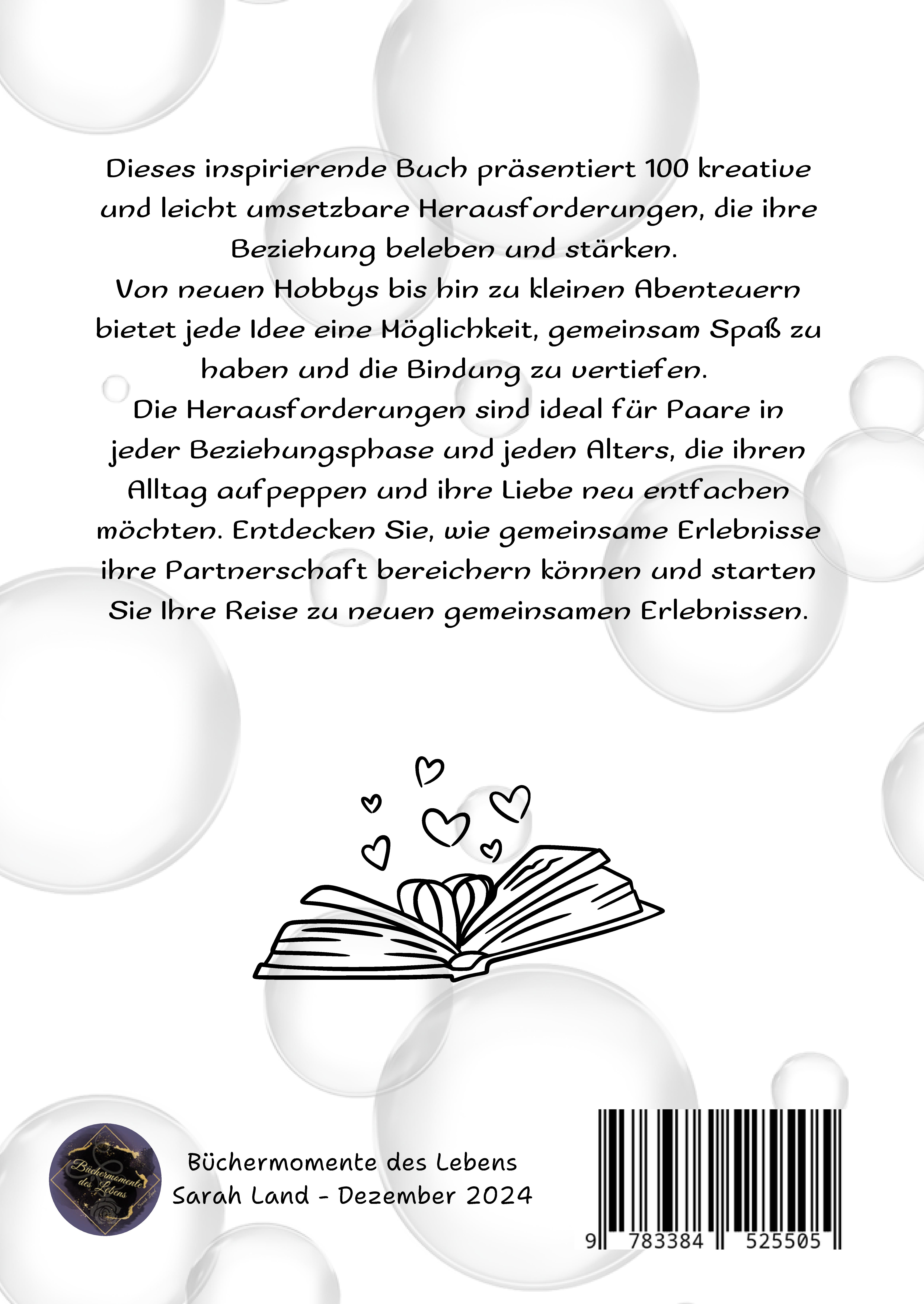 Dieses inspirierende Buch bietet 100 einfache und kreative Herausforderungen, die Ihre Beziehung beleben und stärken können. Jede Herausforderung ist leicht umsetzbar und soll sowohl Spaß machen als auch Ihre Bindung vertiefen. Ob Sie gemeinsam neue Hobbys ausprobieren, kleine Abenteuer erleben oder einfach nur Zeit miteinander verbringen - dieses Buch bietet eine Fülle von Anregungen, um Ihre Partnerschaft zu bereichern. Perfekt für Paare, die ihren Alltag aufpeppen und ihre Liebe neu entfachen möchten.Besondere Merkmale:- 100 leicht umsetzbare Herausforderungen- Kreative Ideen für jeden Tag- Fördert Kommunikation und Zusammenarbeit- Bereichert die Beziehung und bringt Spaß- Ideal für alle Altersgruppen und BeziehungsphasenLassen Sie sich inspirieren und beginnen Sie Ihre Reise zu neuen gemeinsamen Erlebnissen!