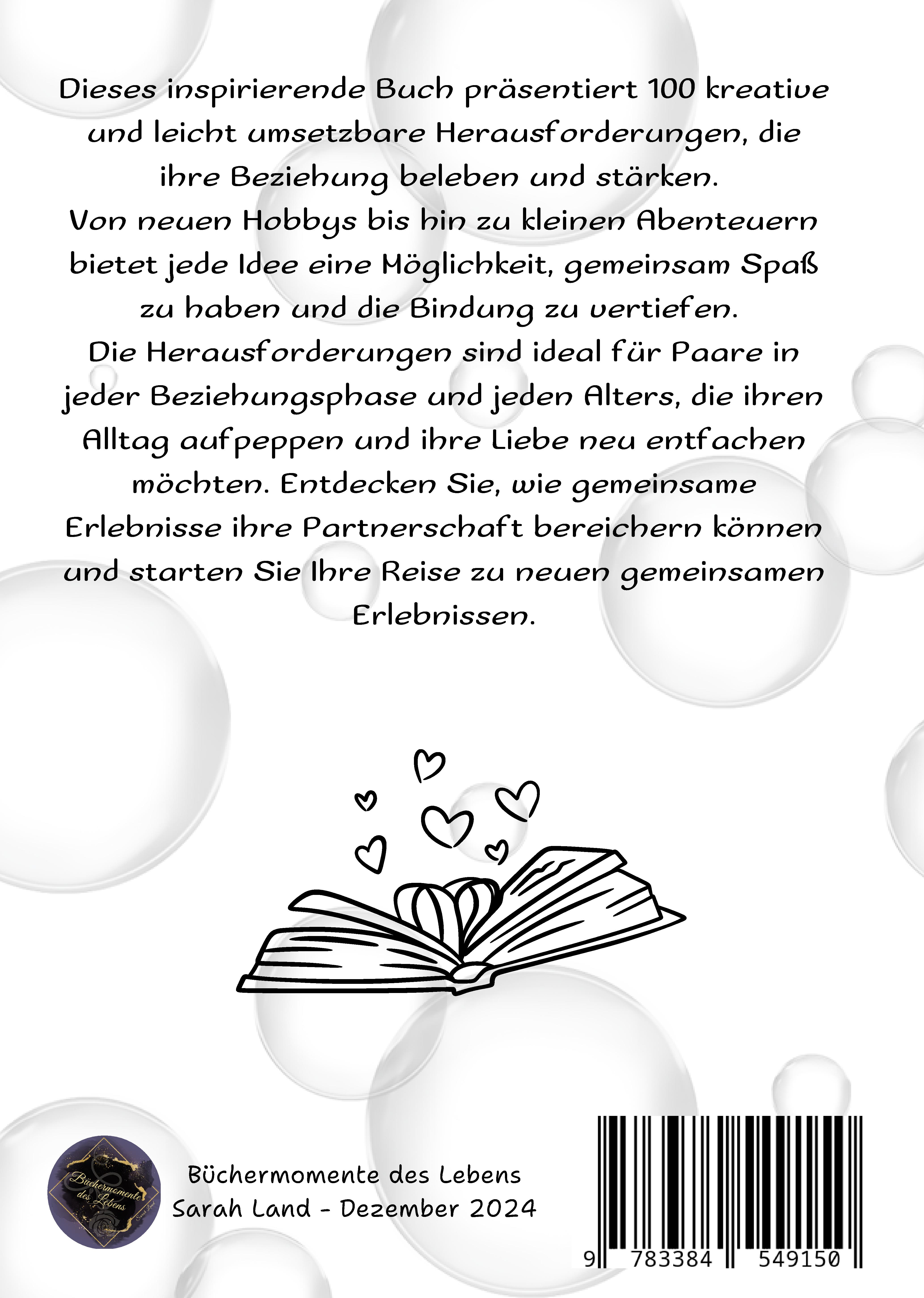 Dieses inspirierende Buch bietet 100 einfache und kreative Herausforderungen, die Ihre Beziehung beleben und stärken können. Jede Herausforderung ist leicht umsetzbar und soll sowohl Spaß machen als auch Ihre Bindung vertiefen. Ob Sie gemeinsam neue Hobbys ausprobieren, kleine Abenteuer erleben oder einfach nur Zeit miteinander verbringen - dieses Buch bietet eine Fülle von Anregungen, um Ihre Partnerschaft zu bereichern. Perfekt für Paare, die ihren Alltag aufpeppen und ihre Liebe neu entfachen möchten.Besondere Merkmale:- 100 leicht umsetzbare Herausforderungen- Kreative Ideen für jeden Tag- Fördert Kommunikation und Zusammenarbeit- Bereichert die Beziehung und bringt Spaß- Ideal für alle Altersgruppen und BeziehungsphasenLassen Sie sich inspirieren und beginnen Sie Ihre Reise zu neuen gemeinsamen Erlebnissen!