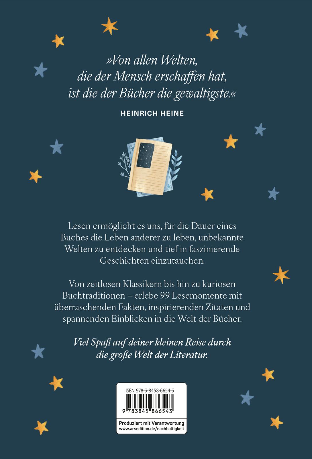 Heinrich Heine sagt: "Von allen Welten, die der Mensch erschaffen hat, ist die der Bücher die Gewaltigste." Denn Lesen ermöglicht es uns, für die Dauer eines Buches die Leben anderer zu leben, unbekannte Welten zu entdecken und tief in faszinierende Geschichten einzutauchen. Dieses dekorative Buch enthält 99 Lesemomente mit überraschenden Fakten, inspirierenden Zitaten und spannenden Einblicken in die Welt der Bücher. Von zeitlosen Klassikern bis hin zu kuriosen Buchtraditionen - entdecke, was Literatur so besonders macht, und lass dich von den bibliophilen Impulsen zum Nachdenken und Träumen anregen. Viel Spaß auf deiner kleinen Reise durch die große Welt der Literatur.