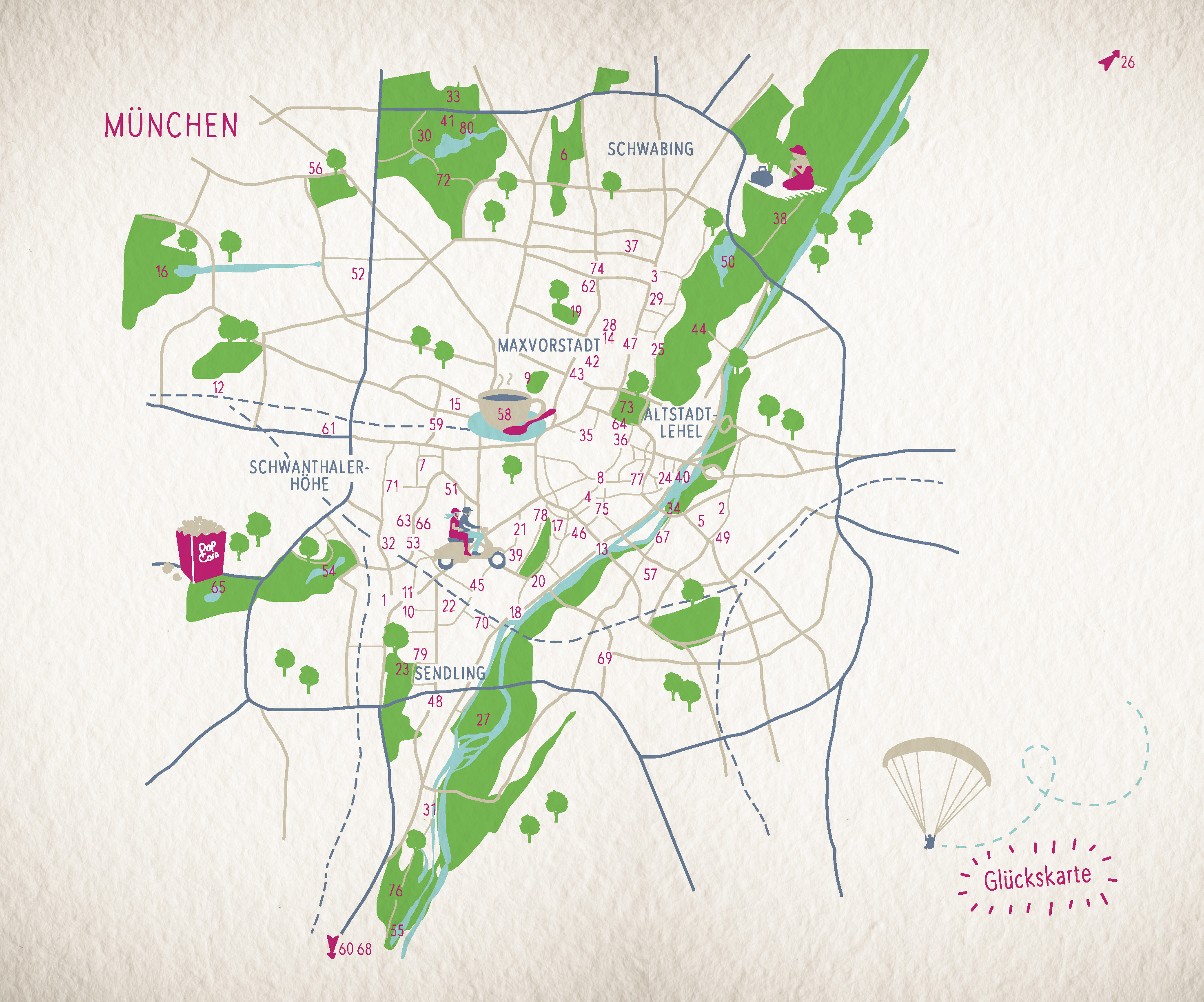 Ein Buch - ein Versprechen: Glück pur! Denn wer sein Glück in München sucht, muss nicht lange strawanzen. Es versteckt sich in verwunschenen Innenhöfen, urigen Boazn und spacigen Ufos. Oder man findet es an bekannten Spots, wenn man nur die Uhrzeit oder den Blickwinkel ändert: Da wird ein U-Bahnhof zu einer Höhle, ein Mauervorsprung zu einem Picknickplatz und ein Partyschuppen zu einem Oma-Café. Am Ende ist klar, dass die Hauptstadt Bayerns vor allem eins ist: Hauptstadt des Glücks!