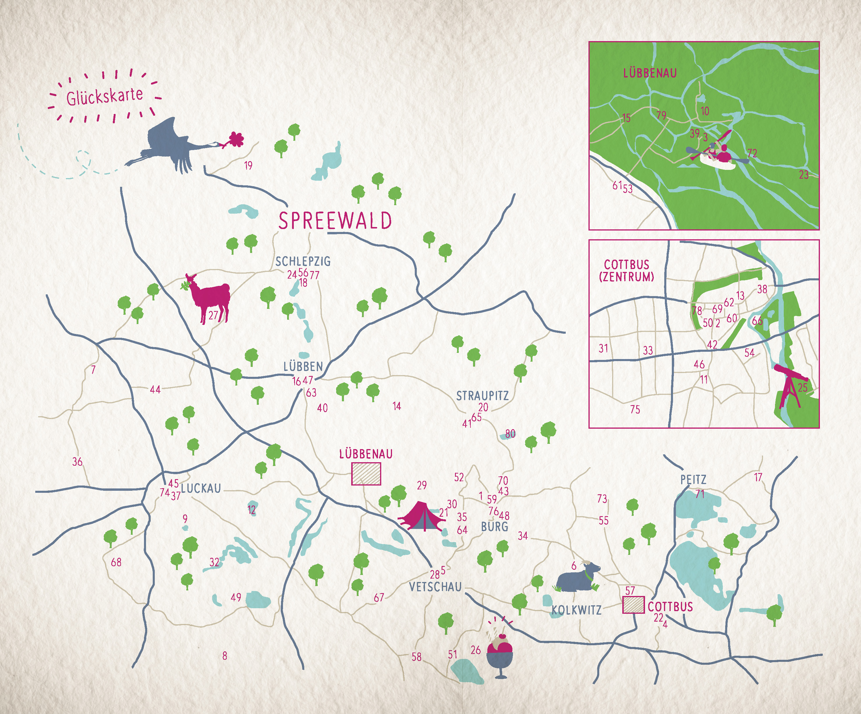 Leise plätschernd durchziehen Wasserläufe das satte Grün der Wiesen; stille Dörfer, Schlösser und Höfe schmiegen sich in die sanfte Landschaft. Im Spreewald ist alles wunderbar im Fluss! Langsam gleitet man im Kanu über die flachen Fließe, taucht in sorbische Geschichte ein oder nimmt auf dem Zeltplatz eine digitale Auszeit. Und nur einen Paddelschlag entfernt lockt die alte Tuchmacherstadt Cottbus mit süßen Baumkuchen, Kunst zum Mitnehmen und dem Blick in die Sterne.