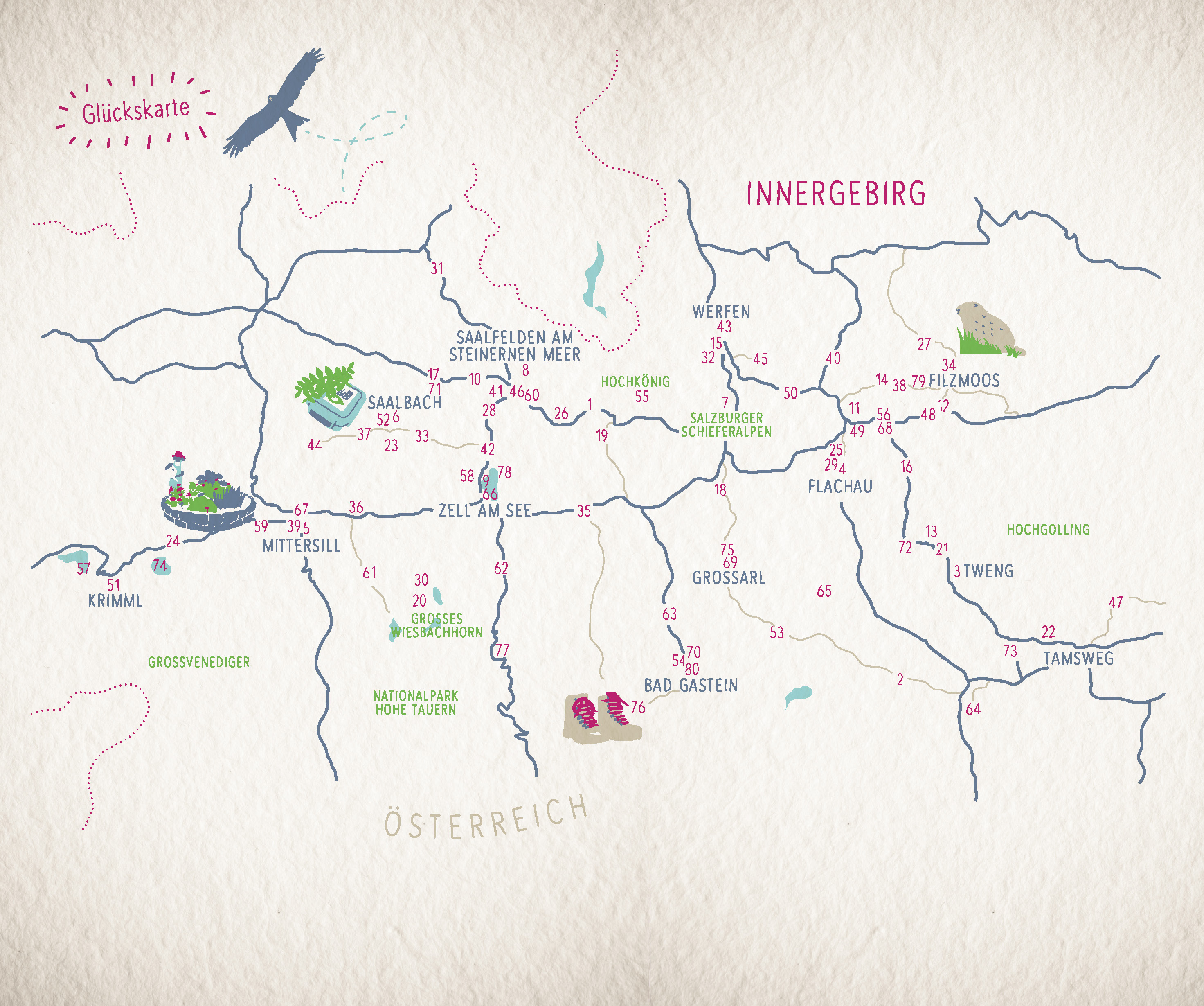 Mächtige Gipfel, stille Bergseen und Überraschungen in jedem Tal: Im Süden des Salzburger Landes lassen die Bezirke Pinzgau, Pongau und Lungau Herzen höherschlagen. Im Nationalpark erlebt man atemberaubende Natur und lauscht dem Pfeifen der Murmeltiere, bevor es schwungvoll abwärtsgeht. Kulinarische Schmankerl verwöhnen den Gaumen und originelle Läden laden zum Stöbern ein. Von der höchsten Bergspitze bis zur eisigen Höhle warten im Innergebirg einzigartige Glücksmomente!