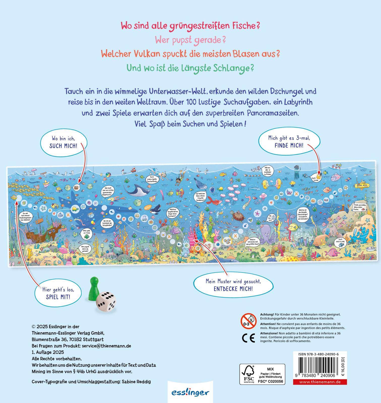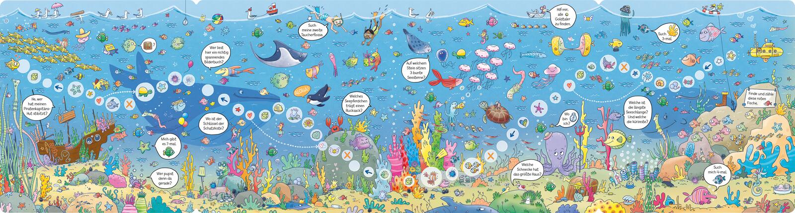 Über 100 lustige Suchaufgaben finden sich auf den 90 cm breiten Panoramaseiten, die von der wimmeligen Unterwasser-Welt über den wilden Dschungel bis in den weiten Weltraum führen.