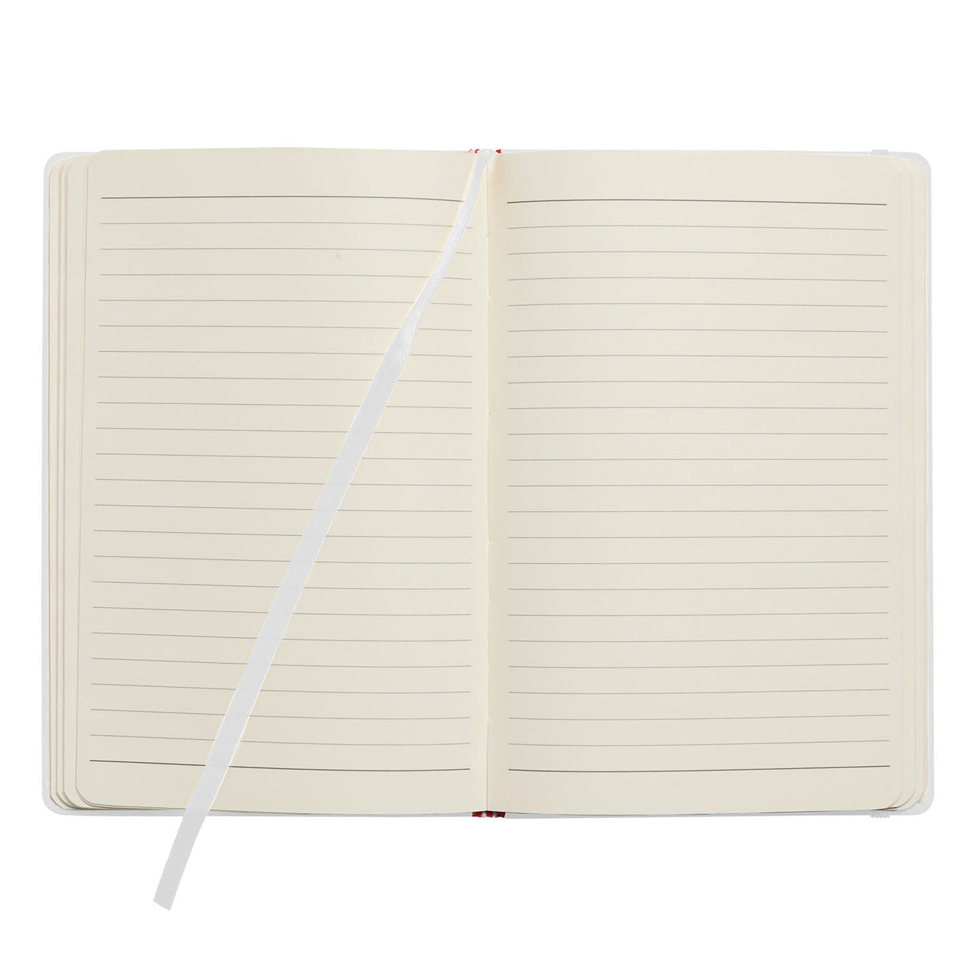 Das A5-Notizbuch mit Hardcover umfasst 192 linierte Seiten, ist mit einem Elastikband verschließbar und hat ein schwarzes Lesebändchen.