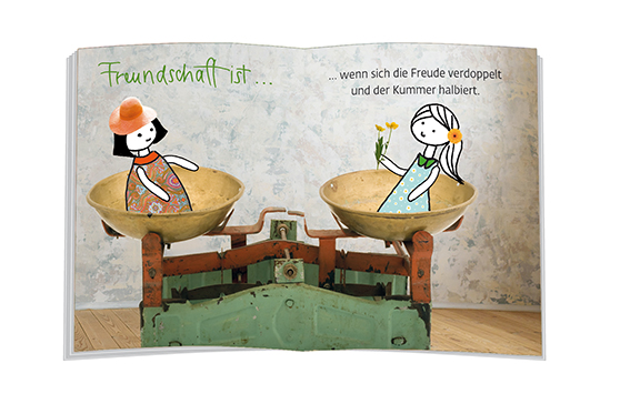 Worauf es im Leben wirklich ankommt, zeigt Jule Lindström und öffnet mit ihrer sympathischen Figur und den erfrischenden Collagen den Blick für das Wesentliche. Sie arbeitet gern mit Fotografie, doch genauso liebt sie die Illustration. Für dieses Geschenkheft hat sie beides kombiniert.
