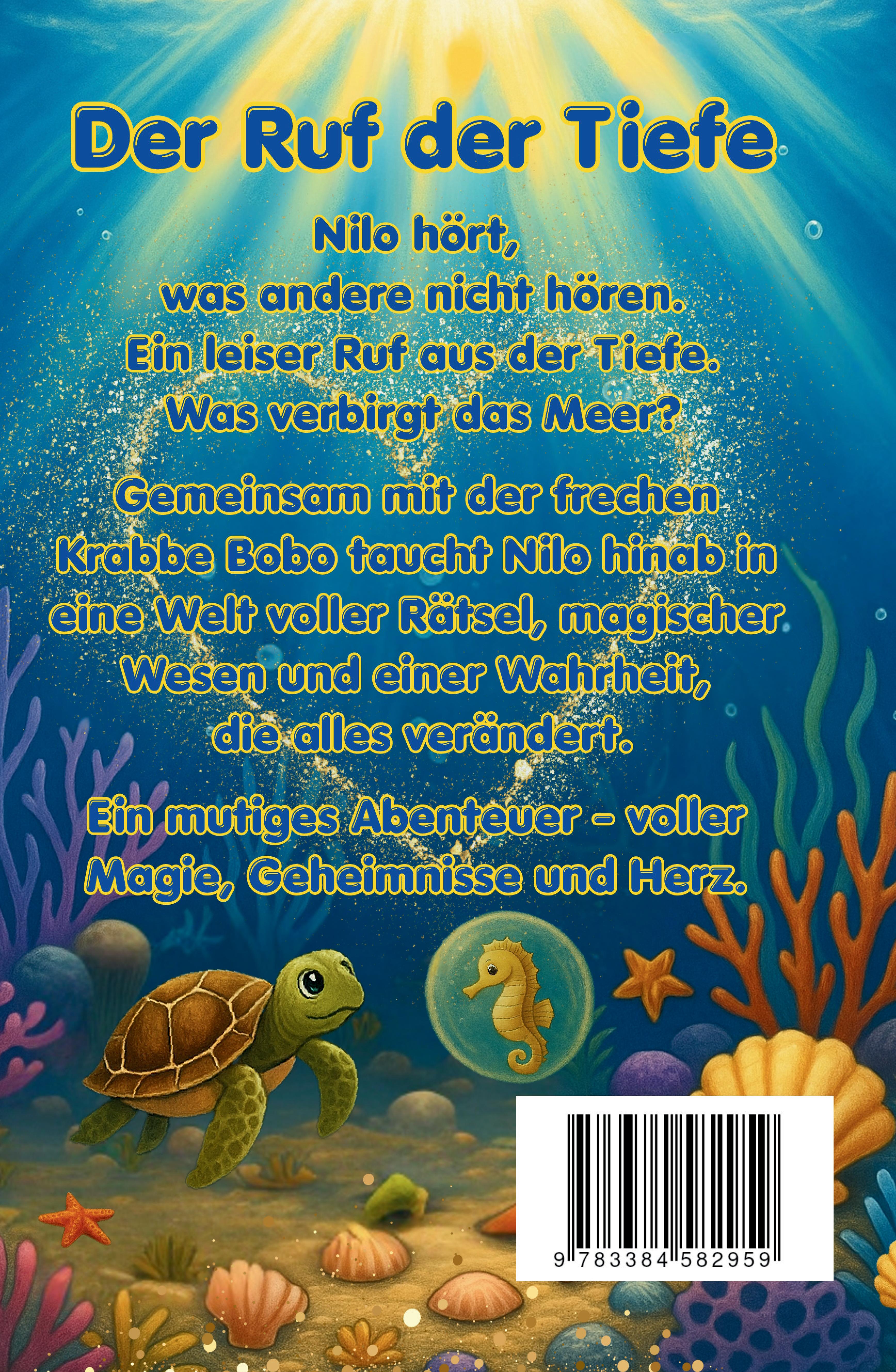 Nilo und der Ruf der Tiefe - Ein Meeresabenteuer über Freundschaft, Mut und innere Stärke - zum Vorlesen und Selbstlesen ab 6 JahrenEin Ruf aus der Tiefe. Ein mutiger Delfin. Eine Reise, die alles verändert. Nilo spürt etwas, das ihn ruft - leise, tief, geheimnisvoll.Zusammen mit der frechen Krabbe Bobo begibt er sich auf eine außergewöhnliche Reise durch die Unterwasserwelt.Sie begegnen sprechenden Zeichen, weisen Meereswesen und stillen Prüfungen.Was sie finden, ist mehr als nur ein Weg - es ist der Mut, sich selbst zu entdecken.Ein Kinderbuch mit Tiefgang! Dieses Buch erzählt in ruhiger, kindgerechter Sprache eine Geschichte über:- die Kraft der Freundschaft- das Wachsen an Herausforderungen- innere Stärke und Selbstvertrauen- die Magie des Meeres und der NaturFür wen ist dieses Buch geeignet?- Für Kinder ab 6 Jahren- Zum Vorlesen am Abend oder in der Schule- Zum ersten Selbstlesen für geübte Leser:innen- Für sensible, fantasievolle und wissbegierige Kinder- Für alle, die das Meer lieben - und Geschichten, die bleibenEin wertvolles Geschenk: Ob zur Einschulung, zum Geburtstag, zu Weihnachten oder einfach zwischendurch - Nilo und der Ruf der Tiefe" ist ein besonderes Geschenk für kleine Abenteurer, die sich trauen, ihrer inneren Stimme zu folgen.
