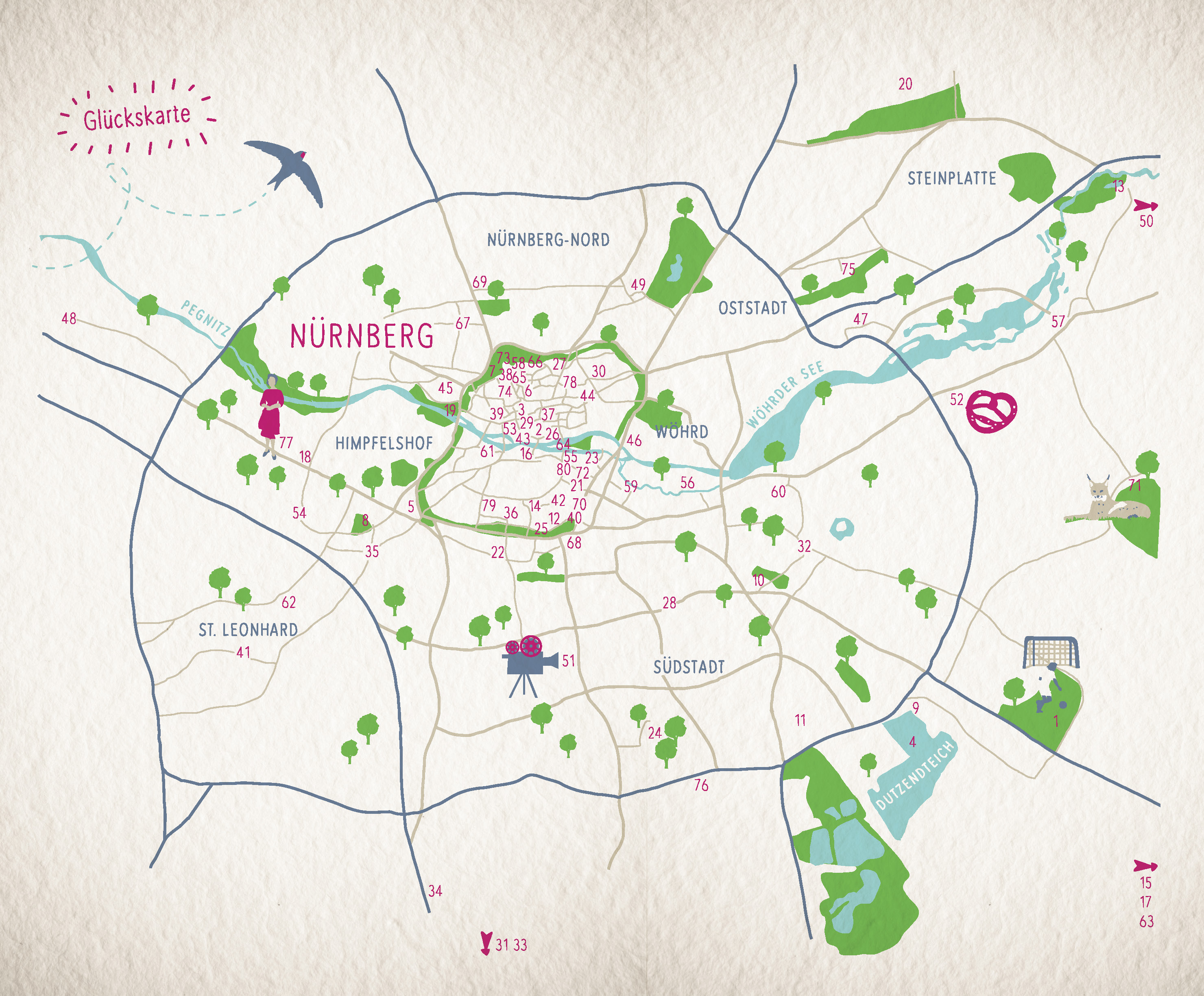 Dieses Buch nimmt mit, die die schönsten Glücksorte in der fränkischen Metropole erkunden wollen. An einem idyllischen Badesee die Sonne genießen, die Stadt in Miniaturform bewundern, leckerste Brezeln im Drive-in abholen - Gert Klaus hat 80 einzigartige Orte in Nürnberg gefunden, die jeden beflügeln! Ob ehrwürdige Wahrzeichen, versteckte Schätze in den Gassen der Altstadt oder bunte Wohlfühlorte - Nürnberg macht einfach jeden glücklich!