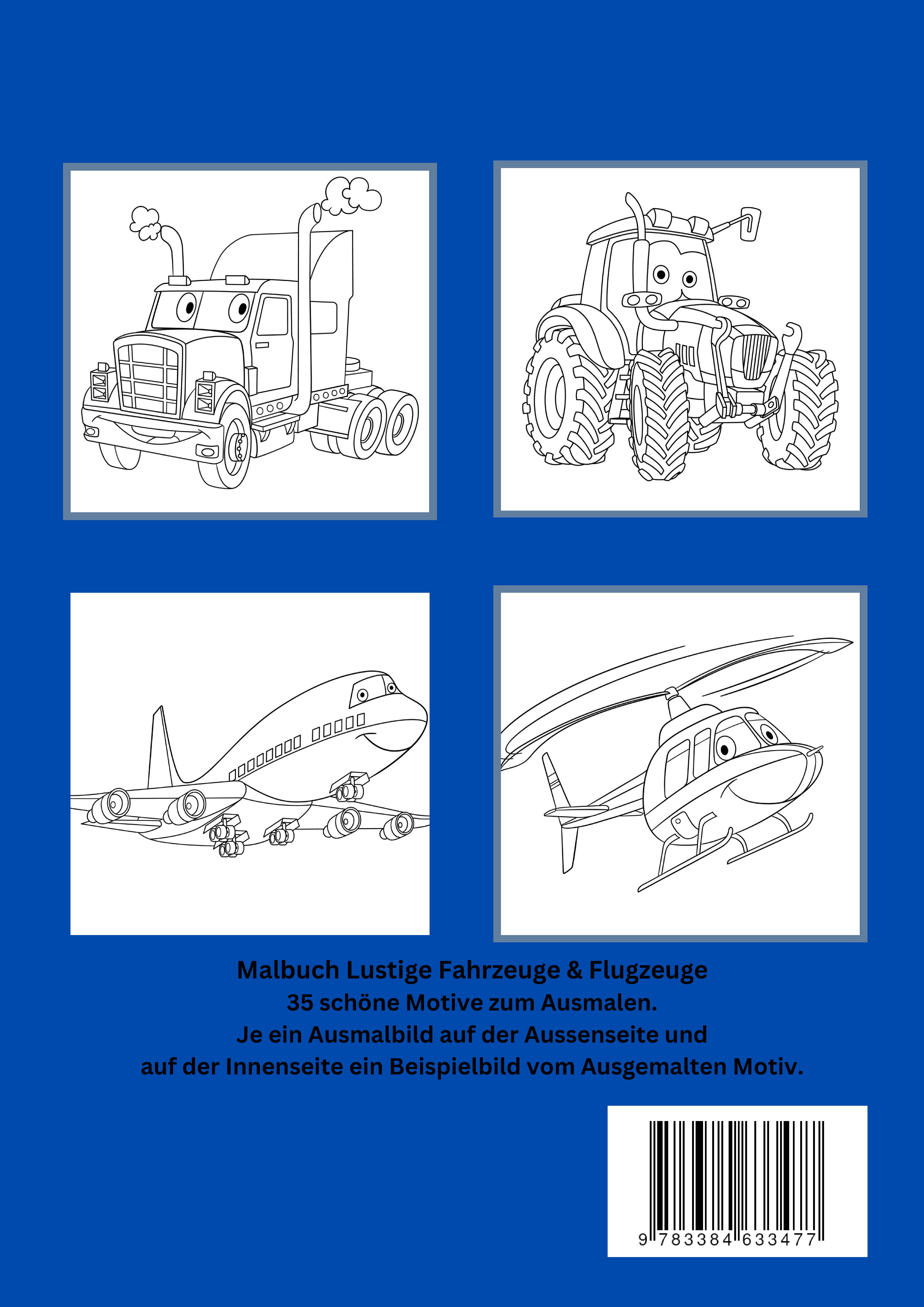 Dieses Malbuch bringt 35 lustige und kreative Motive direkt in die Hände kleiner Künstler. Ob auf der Baustelle, in der Luft oder auf der Straße - die liebevoll gestalteten Designs sorgen für jede Menge Freude beim Ausmalen!Die abwechslungsreichen Illustrationen umfassen eine Vielzahl an Fahrzeugen und Fluggeräten und bieten stundenlangen kreativen Malspaß.Das erwartet dein Kind in diesem Malbuch:Trecker: Lustige Bauernhof-Fahrzeuge mit vielen tollen Details.Feuerwehrauto: Ein spannendes Rettungsfahrzeug, das zum Leben erweckt werden kann.Bagger: Große Baustellenfahrzeuge für kleine Fans von Maschinen.Flugzeug: Unterschiedliche Fluggeräte, die den Himmel erobern.Hubschrauber: Ein weiteres spannendes Fluggerät für kreative Abenteuer.LKW und Transporter: Große und lustige Fahrzeuge, die Kinder gern ausmalen.