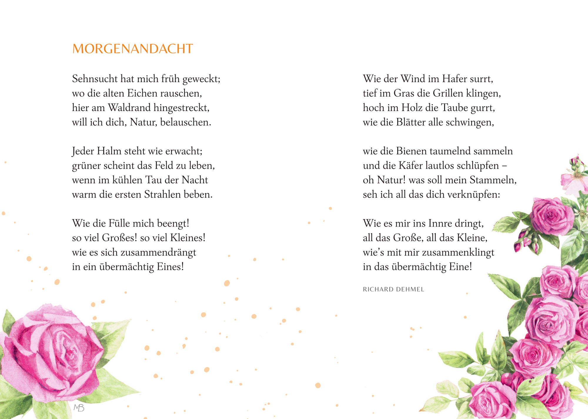 Natur genießen, Ruhe finden, sich inspirieren lassen – dieses Buch begleitet durch die kleinen Glücksmomente des Alltags und führt uns mit Geschichten, Gedichten und Rezepten zu Oasen der Ruhe und Gelassenheit. Liebevoll illustriert von Marjolein Bastin und hochwertig verarbeitet ist es das perfekte Geschenk für Freunde von Natur und Ruhe.