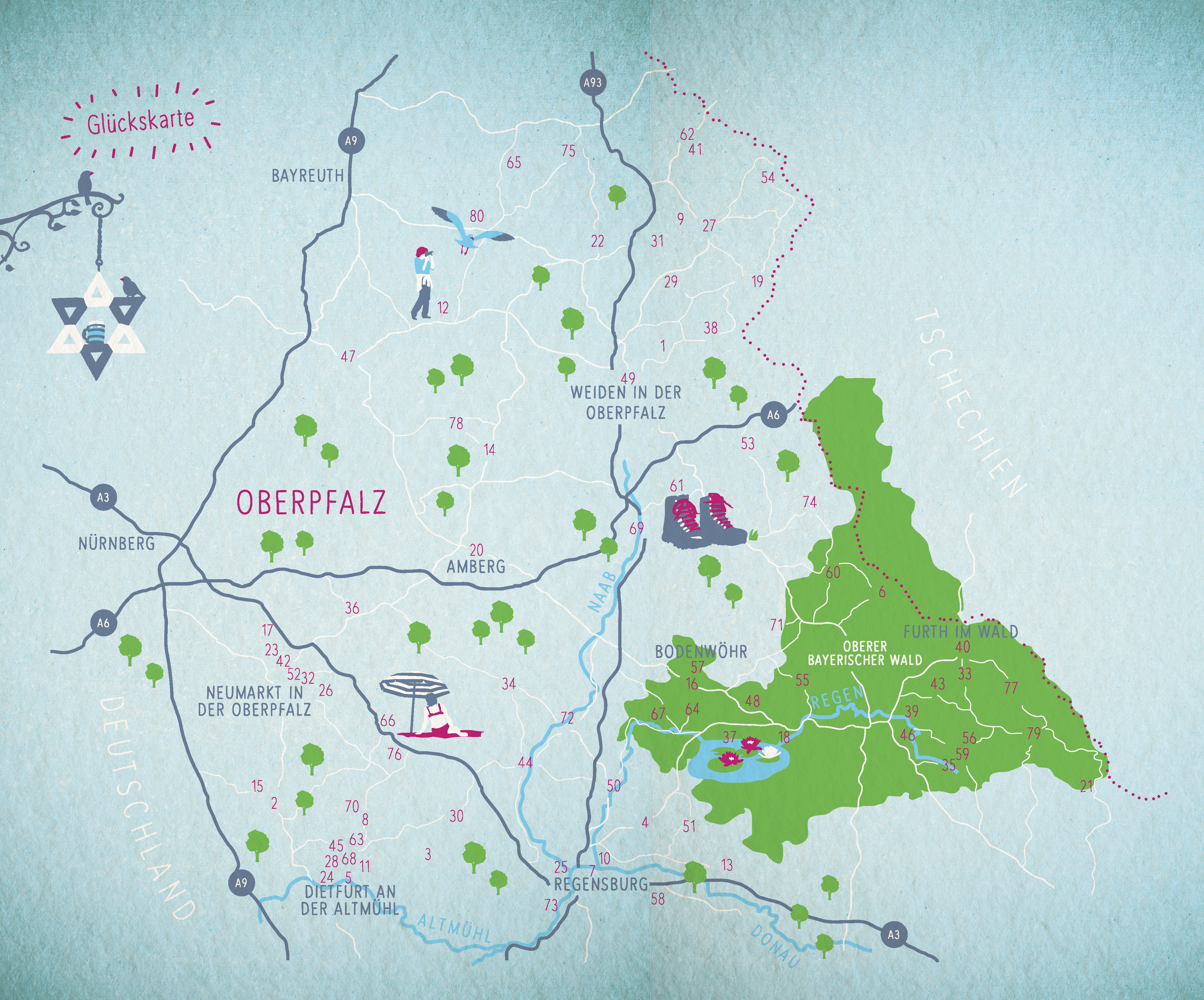 Ein blauer Drachenkopf lugt aus dem Ufergehölz der Naab, ab und an schnellt ein Karpfen durch die Luft, während die Blätter der Bäume fast schon meditativ im Wind rauschen - es sind die kleinen Dinge, die das Leben in der Oberpfalz so erfrischend machen. Ob munter sprudelnde Bächlein und lauschige Badebuchten, majestätische Burgen über grünen Tälern oder malerische Biergärten am Wasser, in denen ein kühles Zoigl im Krug schäumt: So sieht das Paradies aus!