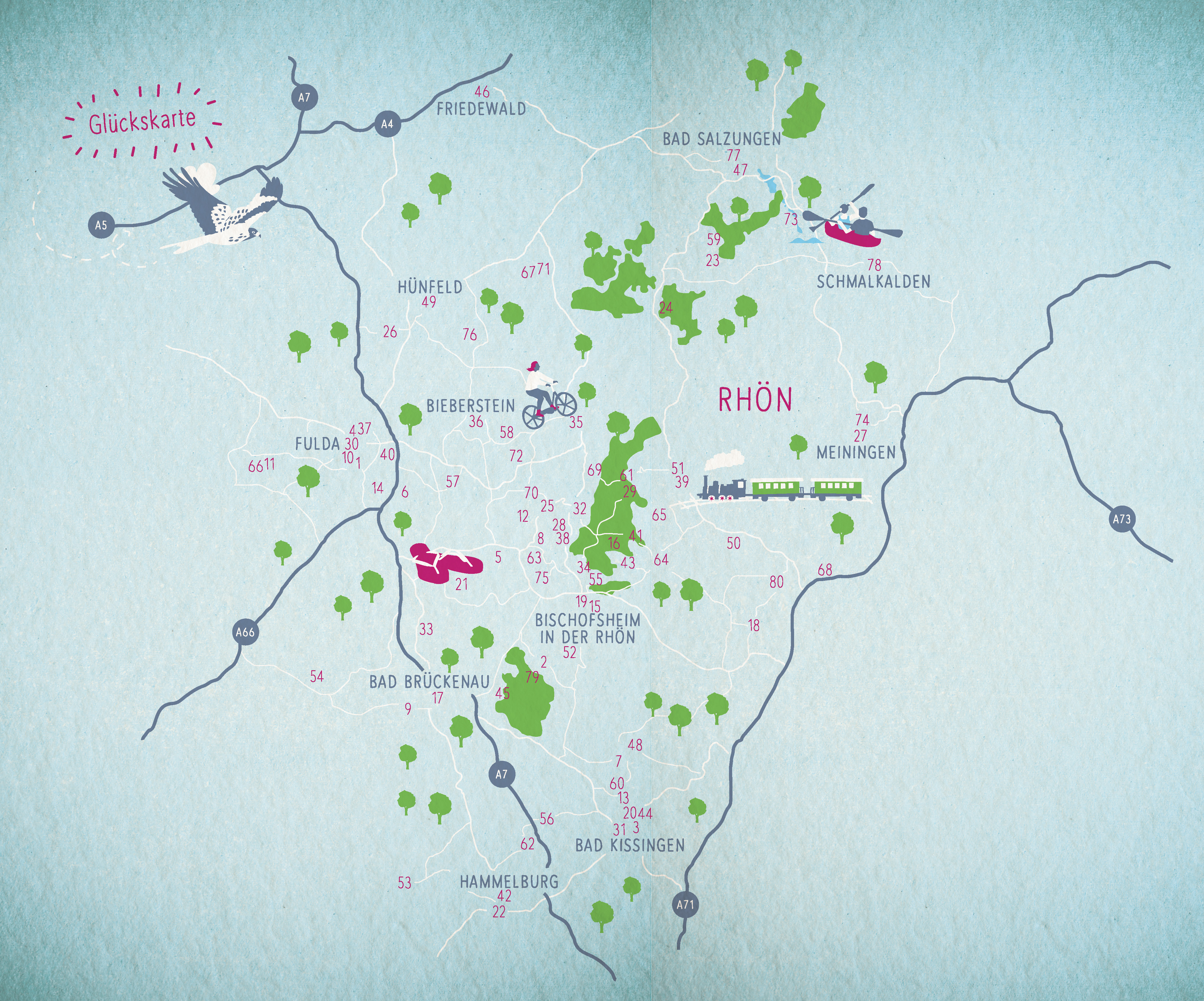 Rauschende Kaskaden ergießen sich durch mystische Wälder, stille Seen schimmern im Sonnenschein und zwischen Birken blubbert geheimnisvoll das Moor: In den grünen Weiten der Rhön verbergen sich unzählige blaue Glücksorte. Dazwischen überraschen quellenreiche Städte mit Wasserschlössern, bunten Osterbrunnen und eleganten Kurparks. Von der Bergtour zur Fuldaquelle bis zur Weltreise in der Wellnessoase: An jeder Ecke sprudeln hier erfrischende Wohlfühlmomente!