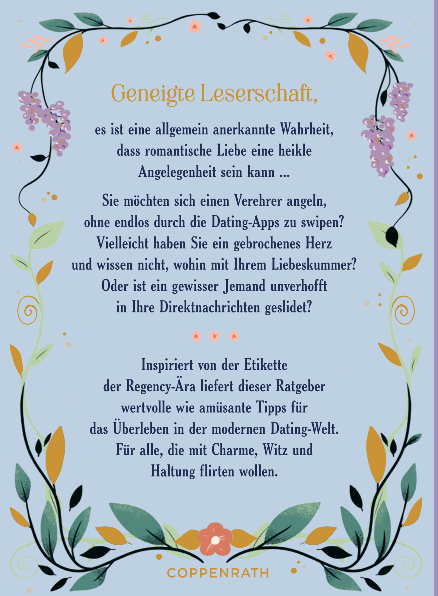 Inspiriert von der Etikette der Regency-Ära, liefert dieser Ratgeber wertvolle wie amüsante Tipps und kreative Impulse für das (Über-)Leben in der modernen Dating-Welt. Ob Liebeskummer, Tinder-Müdigkeit oder lästige Annäherungsversuche im Ballsaal: In alltagsnahen bis skurrilen Szenarien wird das formvollendete Verhalten bei Partnerwahl und -suche reflektiert und die geneigte Leserschaft durch die Höhen und Tiefen des Dating-Lebens begleitet. Ein Geschenk für alle, die mit Charme, Witz und Haltung flirten wollen.