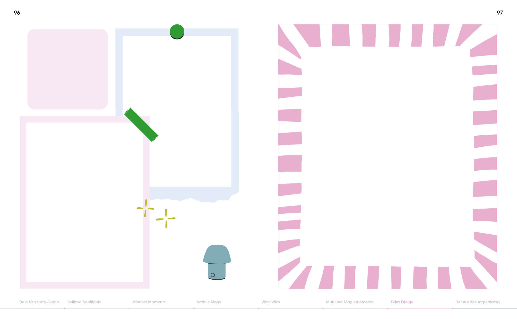 Die Ausstellung beginnt mit einer Einleitung zu verschiedenen Definitionen von Erfolg mit einem Selbsttest, wie sehr du deine Erfolge bereits anerkennst, und klärt über die Psychologie hinter People Pleasing und dem Imposter-Syndrom auf. Weitere Räume der Sammlung beherbergen unter anderem deine Selflove Spotlights, deine Work Wins und deine Sozialen Siege jeglicher Ausprägung. Das Journal enthält dabei neben der musealen Optik - inklusive Museumsplaketten - viel Raum für eigene Kreativität, Fotos, Zeichnungen oder Notizen.