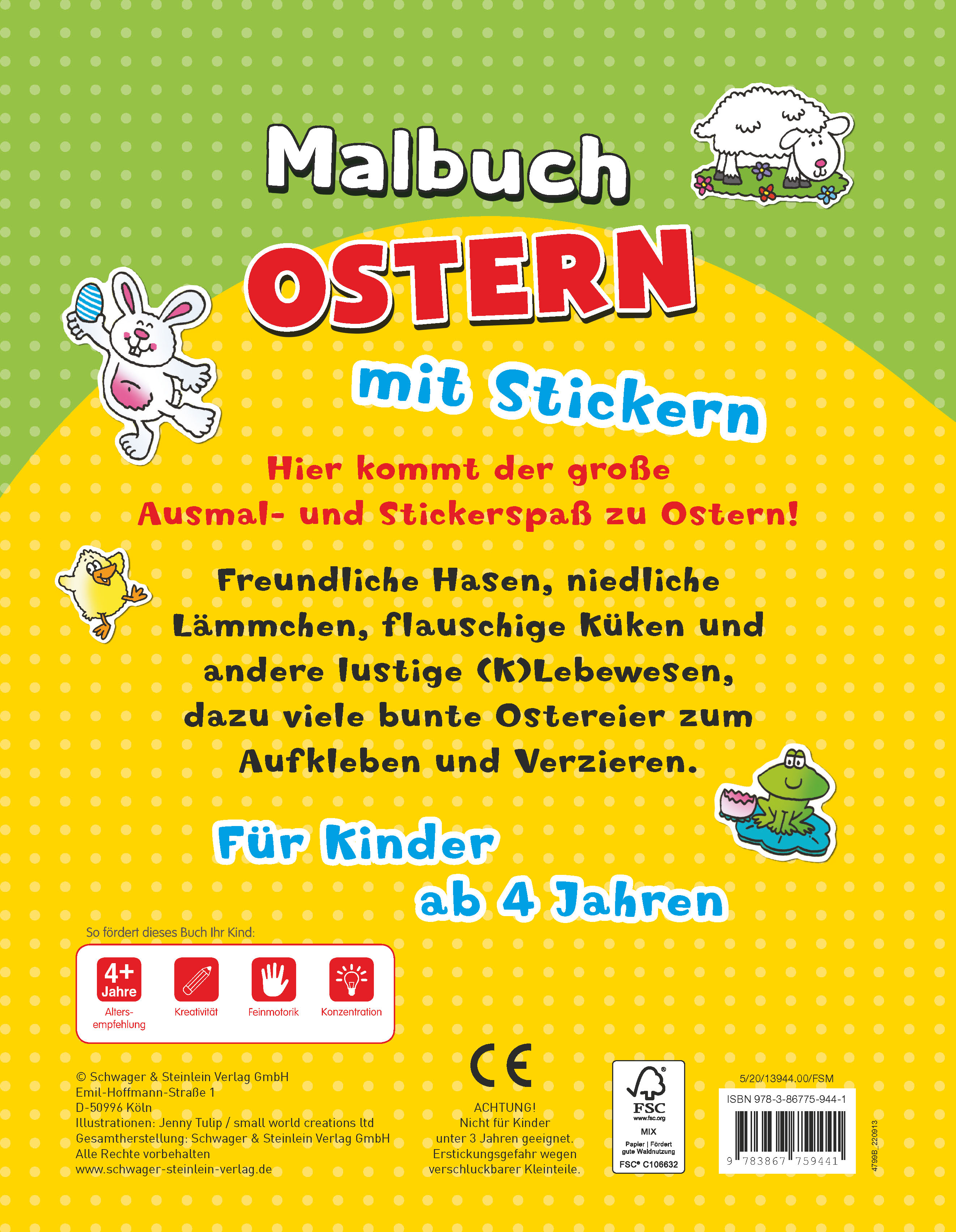 | Schlagworte | 5 Euro • ab 4 Jahren • Ausmalen • Buch • Buch für Frühling • Buch für Kinder • einfache Beschäftigung für zu Hause • für Enkel • für Enkelin • für Kinder • für Neffe • für Nichte • für Sohn • für tochter • _Geschenk • Geschenk • geschenk für osternest • Geschenk-Idee zu Ostern • günstiges Geschenk • Hase • Kinderbuch • Kinderbuch für unterwegs • Kindergartenkinder • Küken • Lamm • Lämmchen • Malbuch • Malbuch mit Tieren • Malbuch (Papeterie) • Osterfest • Osterhase • Ostermalbuch • Ostern • Osternest • Ostern; Papeterie • Schwager & Steinlein Verlag • sinnvolles geschenk • SST • Sticker • Stickerheft für Kinder • Sticker / Stickeralbum (Papeterie) • unter 10 Euro • unter 5 Euro • unter  |