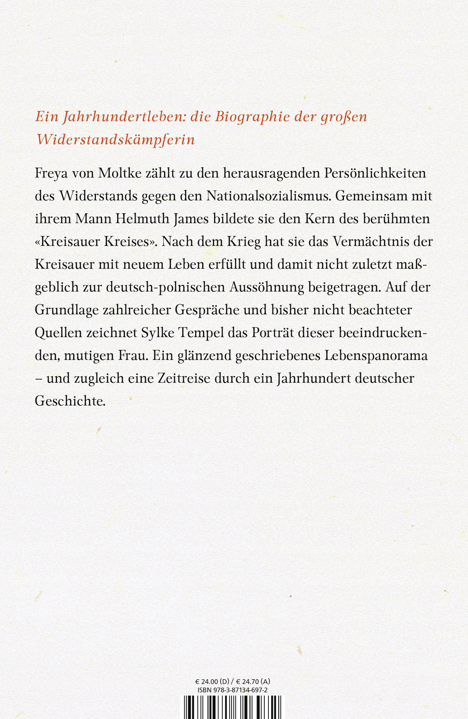 Freya von Moltke zählt zu den herausragenden Persönlichkeiten des Widerstands gegen den Nationalsozialismus. Gemeinsam mit ihrem Mann Helmuth James bildete sie den Kern des berühmten «Kreisauer Kreises». Nach dem Krieg hat sie das Vermächtnis der Kreisauer mit neuem Leben erfüllt und damit nicht zuletzt maßgeblich zur deutsch-polnischen Aussöhnung beigetragen. Auf der Grundlage zahlreicher Gespräche und bisher nicht beachteter Quellen zeichnet Sylke Tempel das Porträt dieser beeindrucken-den, mutigen Frau. Ein glänzend geschriebenes Lebenspanorama - und zugleich eine Zeitreise durch ein Jahrhundert deutscher Geschichte.