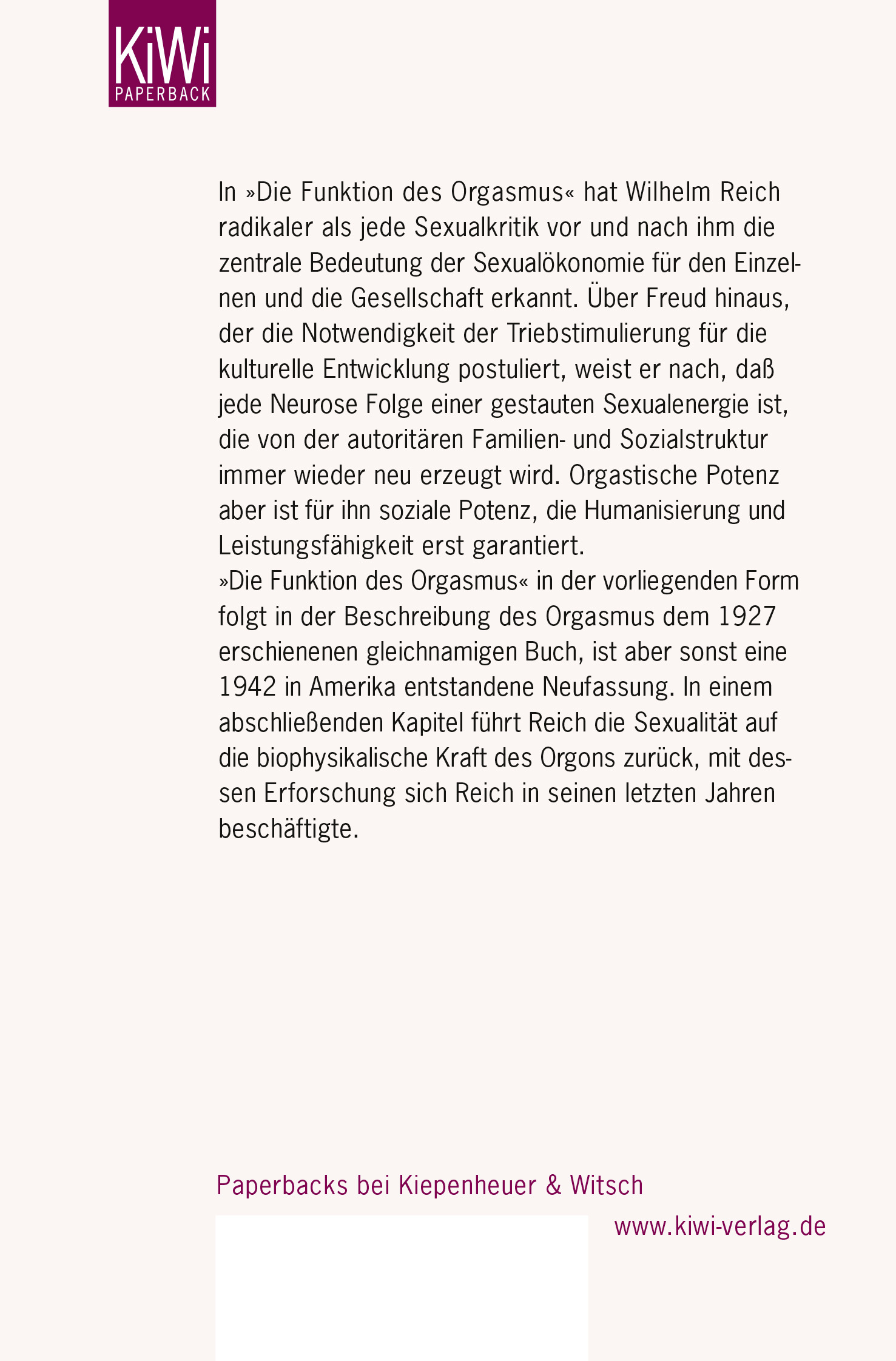 | Schlagworte | Bedeutung • Energie • Entdeckung • Funktion • Gesellschaft • grundproblem • Individuum • Kiepenheuer & Witsch • Neurosen-Entstehung • Orgasmus • Orgon • Sachbuch • Sexualität • Sexual-Ökonomie • Taschenbuch / Sachbücher/Psychologie/Allgemeines, Nachschlagewerke • TB/Sachbücher/Psychologie/Allgemeines, Nachschlagewerke • Wilhelm Reich |