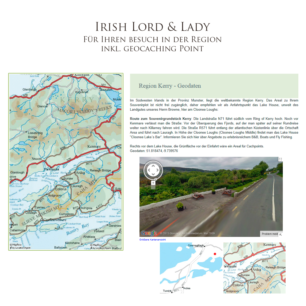 Unsere Geschichte Auf einer Geschäftsreise durch Irland nahmen wir uns auch die Zeit, Land und Leute kennen zu lernen. Mit stetig wachsender Begeisterung lernten wir das Land und trafen auf sehr gastfreundliche Menschen. Zu einem jener Menschen gehörte auch der Ire John Browne, Lord of Kerry. Eigentlich wollten wir ihm nur ein winziges Stück seines riesigen Farmlandes abkaufen, um ein schönes Souvenir mit nach Hause zu bringen. Doch anschließend eröffnete uns Mr. Browne, dass wir nun echte Lords of Kerry wären. Nach anfänglichem "Belächeln" entstand im Pub eine große aber sehr nette und vertrauensvolle Gesprächsrunde. Uns "Fremden" wurden die Zusammenhänge und Ursprünge von Lordtiteln und Landbesitz erklärt. Stolz durften wir uns nun Tirana nennen. Tirana ist die irische Bezeichnung für "Lord" und Landbesitzer. Am Ende dieses Abends gingen wir als Freunde und auch als waschechte Lords mit einem erhabenen Gefühl in unsere Hotelzimmer. Im übrigen checkten wir in Hotels von nun an immer als Lords of Kerry ein und wurden gebührend empfangen. Dies brachte uns auf die Idee, uns auch in anderen Regionen Irlands auf die Suche nach einem Stückchen Land zu machen. In einem Pub in Roscommon lernten wir bei irischer Folkmusik und tollen Gesprächen auch den Besitzer des Pubs, Sean Browne, kennen. Sean hat zwar den gleichen Nachnamen, wie unser erster Freund, aber er ist nicht mit John verwandt. Wir stellten fest, in Irland ist der Name Browne lediglich sehr populär. Sean ist Inhaber der "Hell`s Kitchen Bar & Lounge", ein in der Gegend um den Ort Castlerea ausgesprochen bekannter irischer Pub. Er ist ein leidenschaftlicher Sammler und in einer spektakulären Aktion hatte Sean die letzte Diesellok Irlands in seinen Pub geholt und ein Museum eingerichtet. Ihm erzählten wir von unserer Idee, ein Stückchen Land zu kaufen, wovon er hellauf begeistert war. Wir begaben uns später in sein Büro und regelten die Formalitäten. Neben diesem Stückchen Land, erhielten wir sogar exklusiv echten irischen Boden - Irish Soil - in einem Einmachglas, direkt aus seinem Vorgarten. In Sligo - dem berühmten Golferparadies an der schroffen Atlantikküste, gibt es einen atemberaubenden Strand. Dort wo die Straße am Strand endet, ist eine grandiose Brandung und hier steht ein traditionelles Strandhaus. Von diesem Küstenstreifen brachten wir auch ein kleines Stück Land mit nach Hause. Epilog Wir möchten Sie mitnehmen und Sie an der Begeisterung teil haben lassen, einen klangvollen Edeltitel tragen zu können. Ein waschechter Lord zu sein oder als klangvolle Lady gerufen zu werden ist eine tolle Sache, die Eindruck macht!