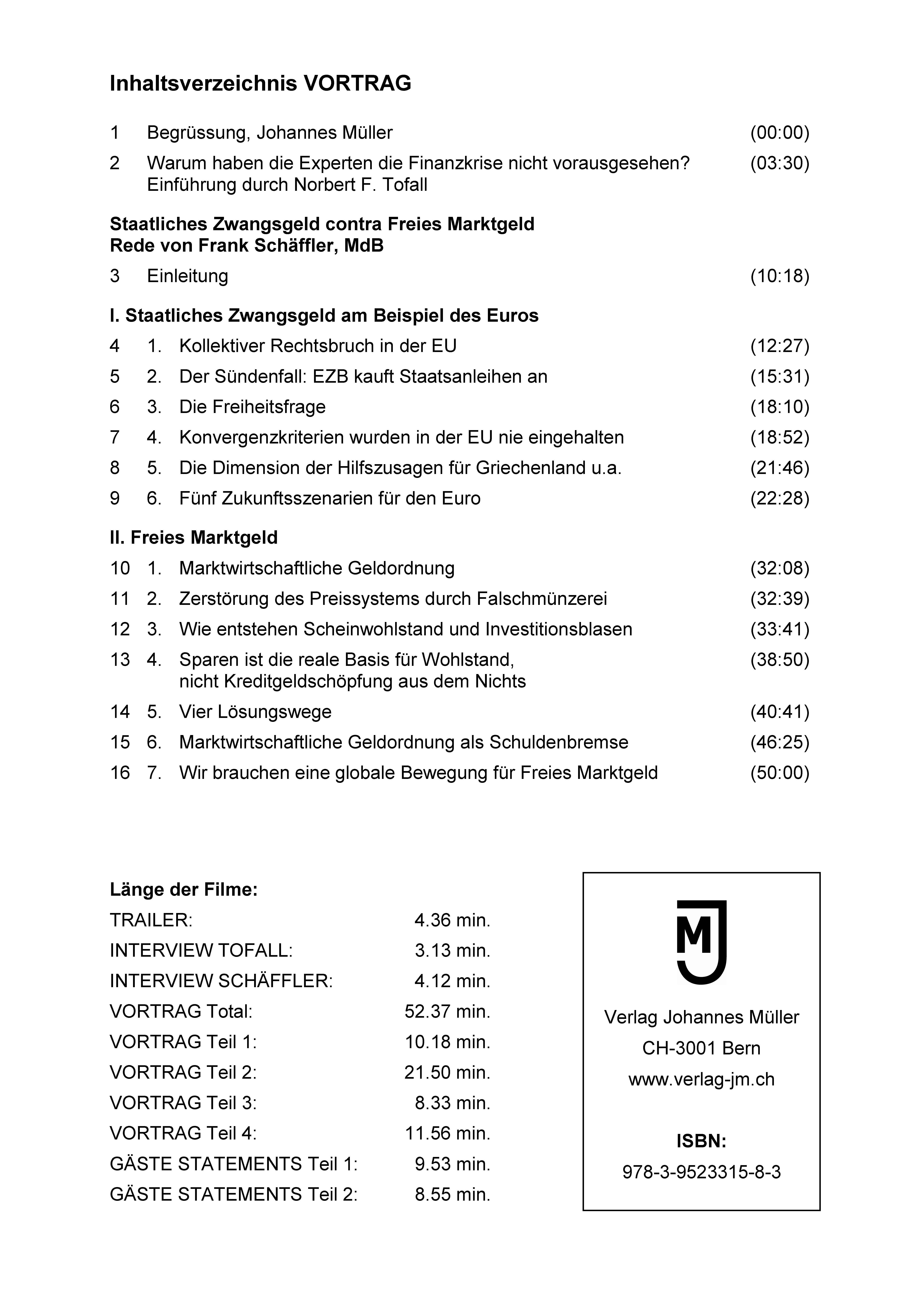 | Schlagworte | Deutsche Bundesbank • Eigentumsrechte • Eigenverantwortung • Euro • Euro-Krise • Freie Marktwirtschaft • Freies Marktgeld • Freiheit • Friedrich A. Hayek • Geld • Geld; DVD • Geldentwertung • Geldpolitik • Geldwirtschaft • Gold • Inflation • Kaufkraft • Liberalismus • Ludwig von Mises • Marktwirtschaft • Marktwirtschaftliche Geldordnung • Monopol • Nationalbanken • Oesterreichische Schule der Nationalökonomie • Silber • SNB Schweizerische Nationalbank • Staatliches Zwangsgeld • Währung • Währungskrise • Währungswettbewerb • Weltwirtschaftskrise • Wettbewerb (Wirtschaft) • Zentralbank • Zentralbanken |