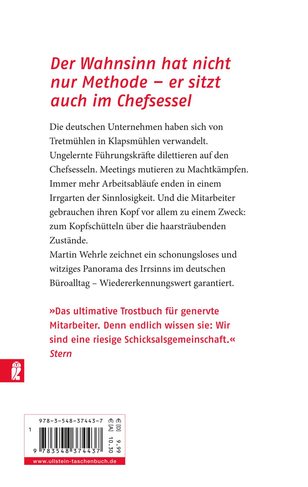 Die deutschen Unternehmen haben sich von Tretmühlen in Klapsmühlen verwandelt. Ungelernte Führungskräfte dilettieren auf den Chefsesseln. Meetings mutieren zu Machtkämpfen. Immer mehr Arbeitsabläufe enden in einem Irrgarten der Sinnlosigkeit. Und die Mitarbeiter gebrauchen ihren Kopf vor allem zu einem Zweck: zum Kopfschütteln über die haarsträubenden Zustände. Martin Wehrle zeichnet ein schonungsloses und witziges Panorama des Irrsinns im deutschen Büroalltag - Wiedererkennungswert garantiert.